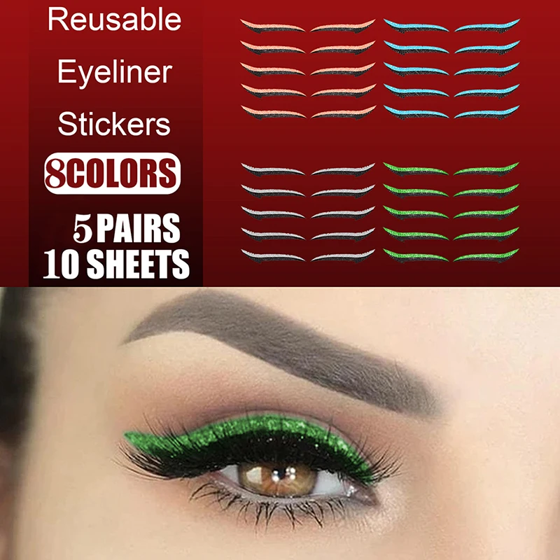 Особенности:1. Различные стилиМногоразовые наклейки для подводки век имеют 8 различных цветов наклейки для подводки век, и есть больше вариантов, чтобы удовлетворить ваш удивительный макияж.2. Водонепроницаемость и безопасность использованияМногоразовые наклейки для подводки век являются водонепроницаемыми и долговечными и могут сохранять оригинальную форму и цвет в течение 3-5 дней.3. Легко использовать и сниматьНаша многоразовая подводка для глаз имеет контур глаз рядом с телом, поэтому, когда вы поместите их в нужное место на глаза, вы можете легко приклеивать их, не беспокоясь о перекосах. Высококачественные косметические ингредиенты могут быть полностью разорваны и очень удобны при прилипании к коже без каких-либо болей. Очень важно, чтобы вы могли легко снять краску с помощью средства для снятия макияжа, масла для тела и спирта.4. Идеально подходит для всех случаевМногоразовые наклейки для подводки век могут сделать вас сиять в Хэллоуин, ночных клубах, маскарад, карнавал, косплей, день рождения, фотосессии и других случаях. Создайте свой уникальный стиль.