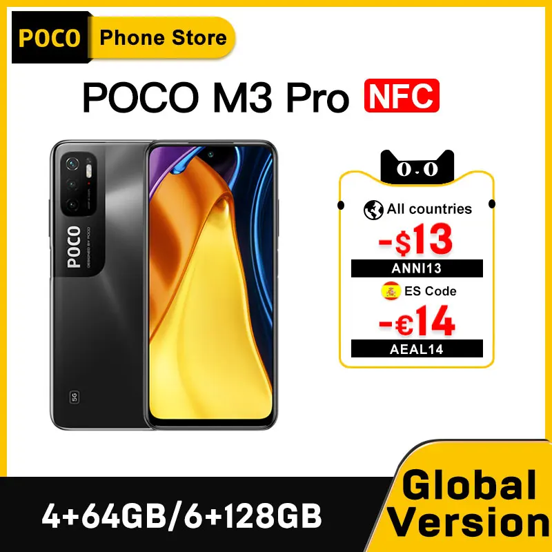 Флэш-накопитель глобальная версия POCO M3 Pro, 4 ГБ, 64 ГБ6 ГБ, 12 Гб, NFC, 700 дюймов, Восьмиядерный процессор, 90 Гц, 6,5 дюйма, FHD +, DotDisplay, 5000 мАч, 48 МП, тройная камера