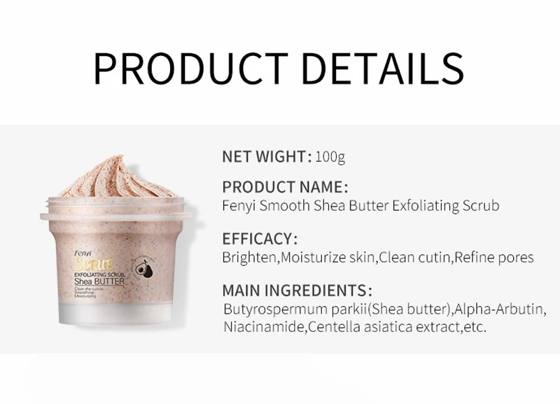 Название продукта: очищающий скраб для тела с маслом шиОсновные ингредиенты: глицерин, никотинамид, аллантоин, экстракт центеллы, экстракт масла ши.Вес нетто: 100 гПодходит для: грубой, роговой кожи; Подходит для всех типов кожи.Эффективность: тонкие поры, увлажнение, мягкое Отшелушивание, мягкая кожа