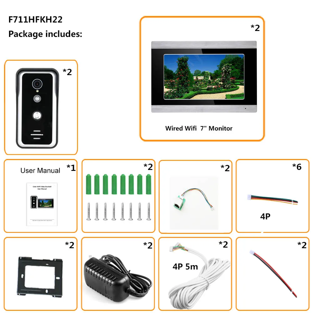Аксессуар:2 * внутренний монитор2 * наружный блок2*15 в источник питания3*4-ядерный) провод с клеммой сечением (5 м)2 * RJ45 клеммный провод1 * провод для разблокировки1 * Руководство пользователя2 * Монтажная пластина2 * винты1 * цветная посылка