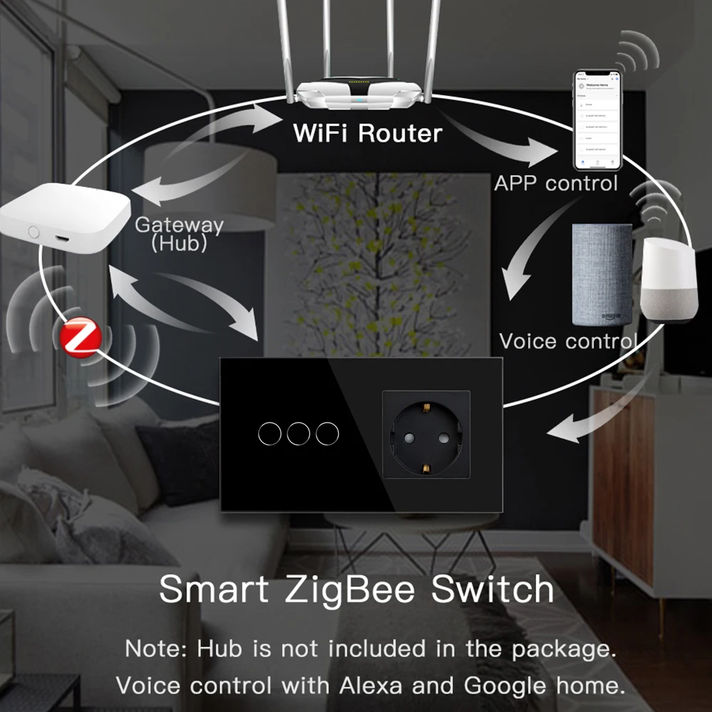 BSEED 3 Gang Zigbee Tuya Wifi сенсорный выключатель с европейской стандартной розеткой голосовое приложение Управление работает с Alexa Google Home