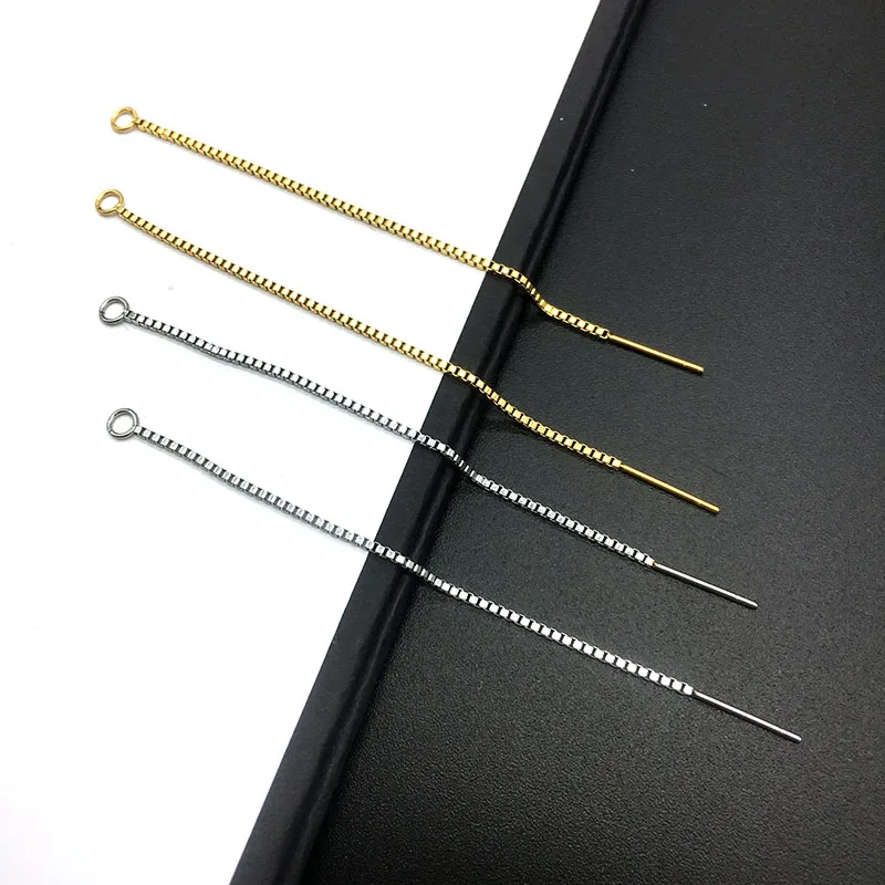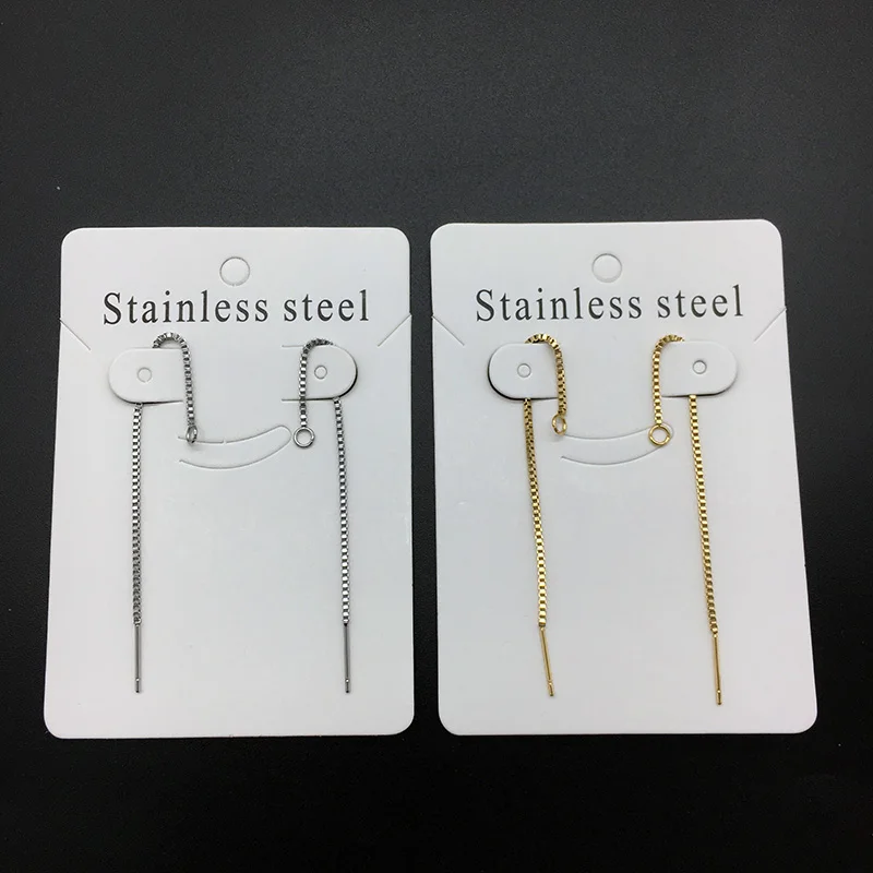 1) Тип Металлов: нержавеющая сталь2) Количество и упаковка: 4 шт., полиэтиленовый пакет3) Форма: булавка-цепочка в коробке4) Цвет: сталь и золото5) Особенности: тренд6) Длина и вес: 112 мм и 1,2 г7) вид: серьги-булавки, серьги-цепочки