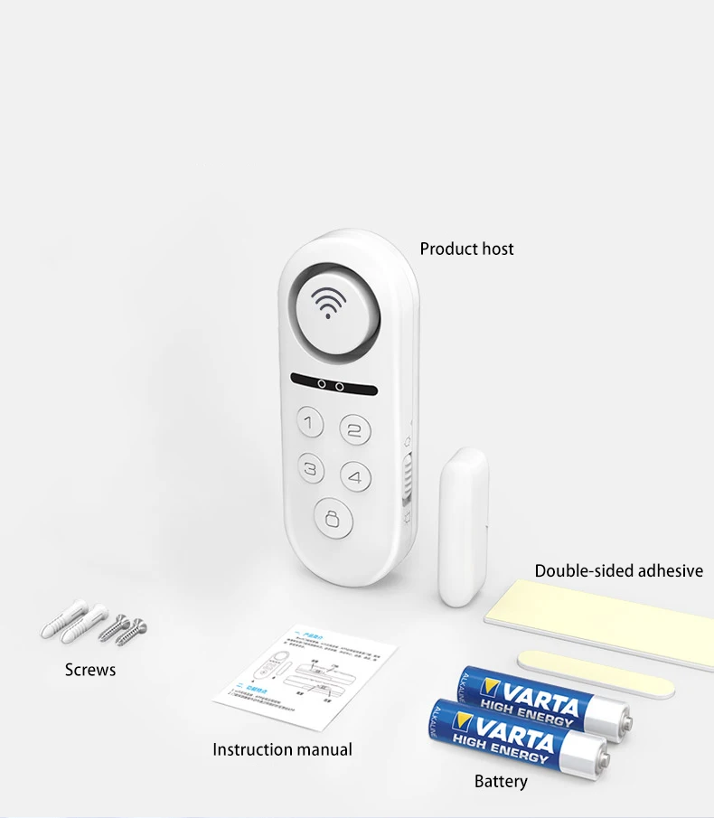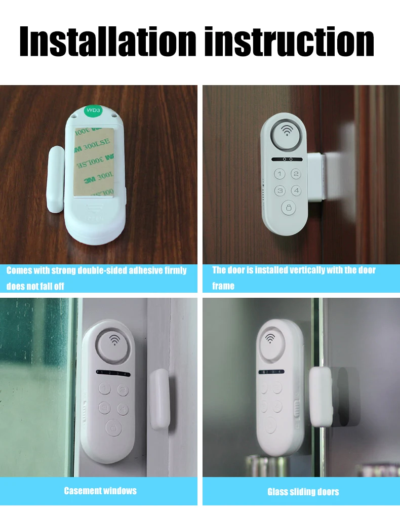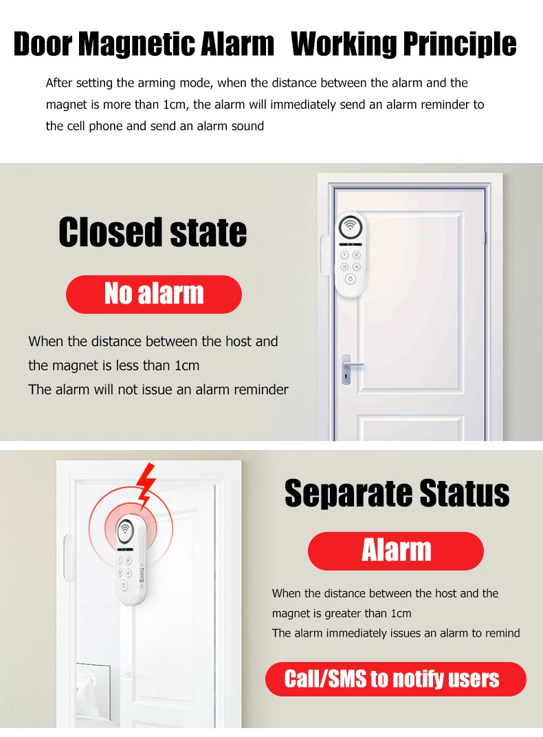 3. Четыре цифровой пароль для снятия, что позволяет избежать злоумышленников для снятия его немедленно.4. Принцип работы дверной датчик тревоги: после установки режим будильника, в тех случаях, когда для этого способа работы расстояние между сигнализации и магнит является более 1,5 см, сигнал тревоги будет сразу посылает сигнал тревоги напоминание мобильный телефон и компьютерных игр на платформе и издавать сигнал тревоги