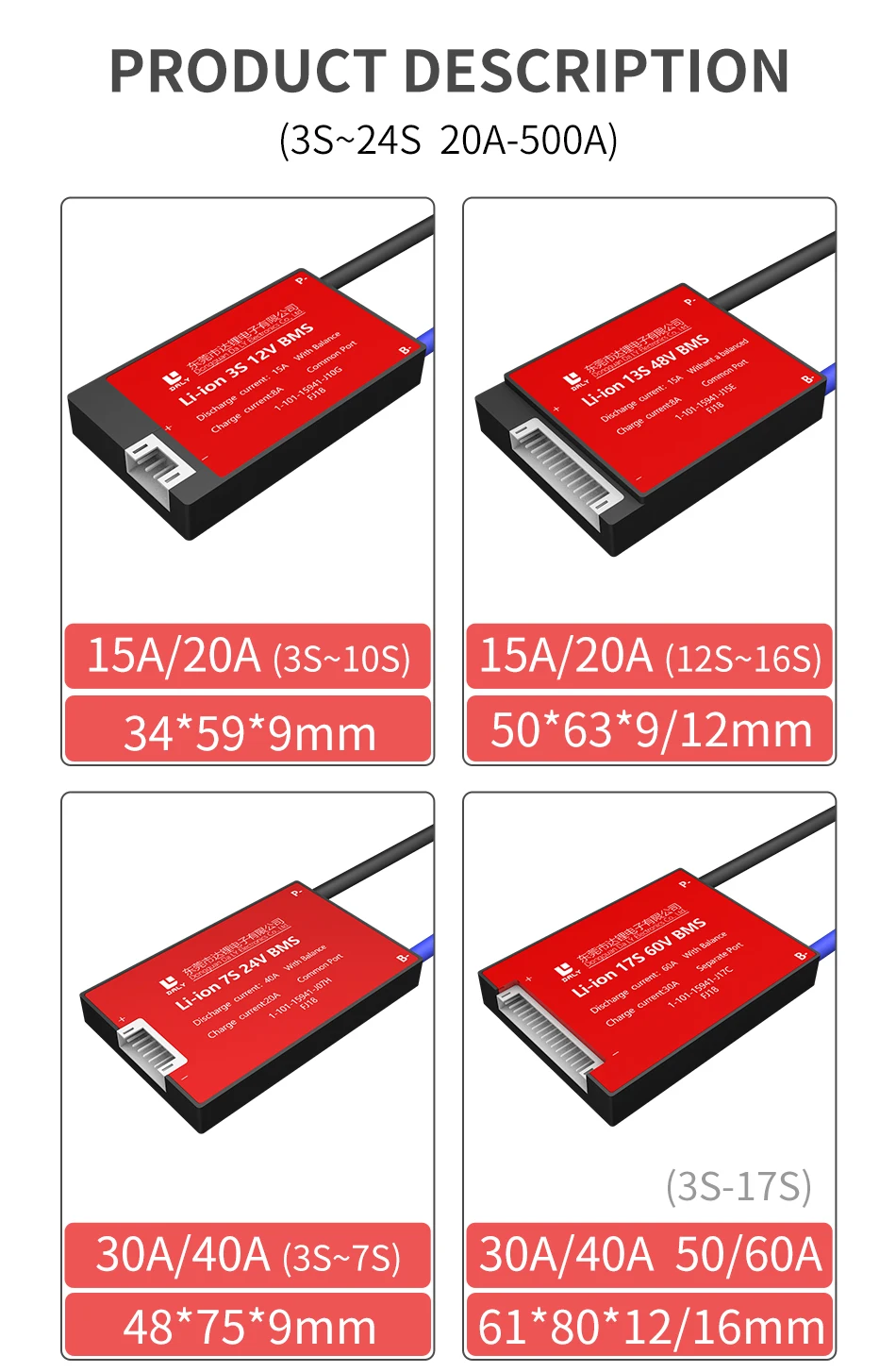 Обзор◆ DL3S-32S 40A -500A bms используется для 12V-120V аккумуляторной батареи.◆Мы можем спроектировать его для различных литиевых батарей, таких как LiFepo4, LiMn2O4, Li-polymer и т. д.◆Основные функции: защита от перезарядки, защита от разрядки, защита от перегрузки по току, защита от короткого замыкания, защита от температуры и т. д.◆В соответствии с запросом клиента мы можем разработать PCM различных размеров и конструкций.◆BMS изготовлено высококачественными Mos и IC импортированными. Храните аккумулятор в течение длительного цикла.2. Преимущество◆Используйте высококачественный (A-level) защитный интегральный замыкание IC, от решения Seiko из Японии.◆Сильная способность нагрузки, постоянная разрядка тока 15A 20A 30A 40A 50A 60A 80A, использование высокого напряжения сопротивления, низкая внутренняяСопротивление мощности Mosfet. Теплоотвод значительно поможет охлаждению.Сам ◆IC имеет функцию балансировки мощности. Схема проста и надежна.◆Типичное Обнаружение напряжения для каждой ячейки. Таким образом, каждый аккумулятор будет предотвращен из-за заряда или разрядки. Функция защиты от перегрузки по току и короткого замыкания очень надежная. Долгое время короткого замыкания нагрузки не повлияет на печатную плату и батарею. Защита от температуры во время зарядки и разрядки.◆Extreme низкая потребеление энергии. Потребление всего устройства составляет менее 50uA.◆PCB использует высокие антикоррозийные, Высокая водонепроницаемость, высокое сопротивление ОУР Формальное покрытие.