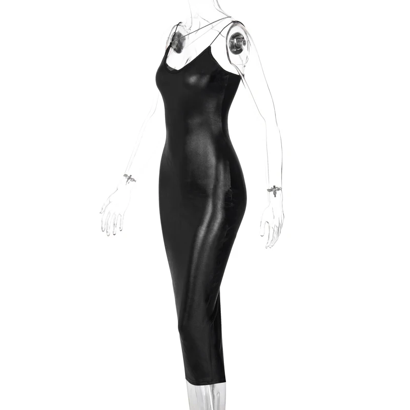 Pu искусственная кожа женские миди платье на бретелях с v-образным вырезом с низким вырезом на спине и открытыми плечами облегающее сексуальное уличная вечерние элегантные осень-зима клуб