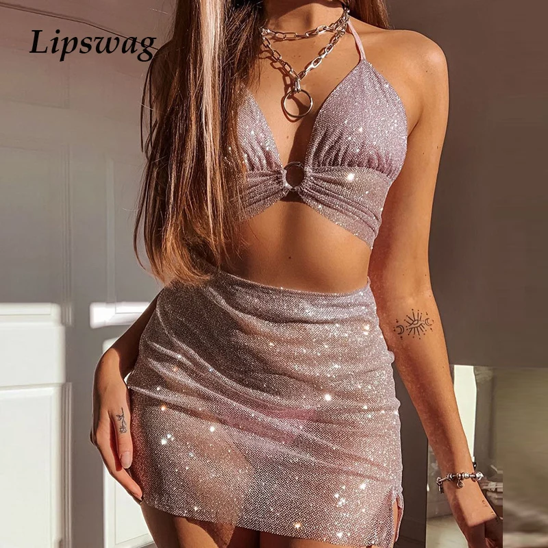 2 шт.компл. спортивный костюм сексуальный Для женщин клуб уличная сетчатые прозрачные см несмотря на то, что трубки Топы на бретельках с пайетками Высокая Талия юбки пляжная одежда