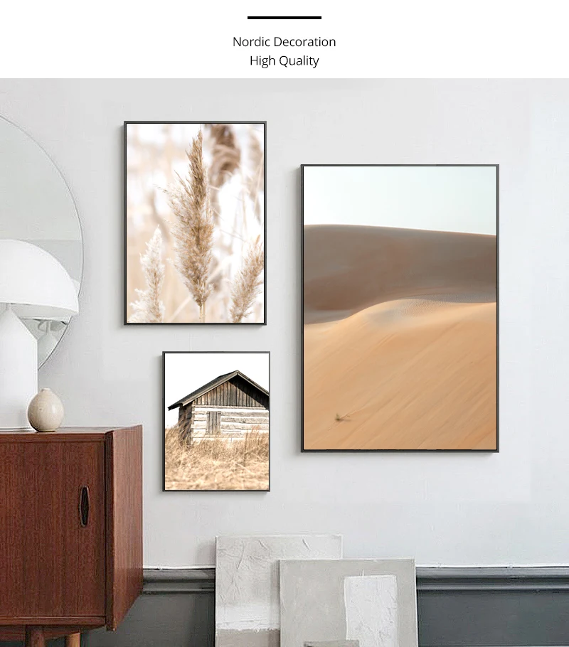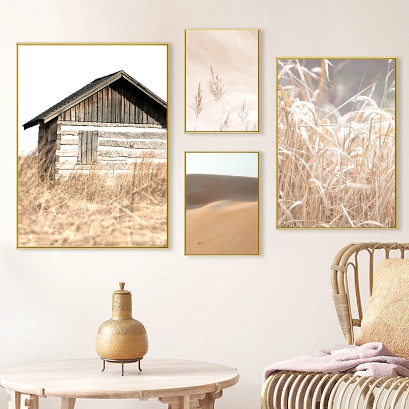 Настенная картина с изображением пустынного сена тростника, деревянного дома, абстрактные линейные плакаты и принты в скандинавском стиле, декор для гостиной