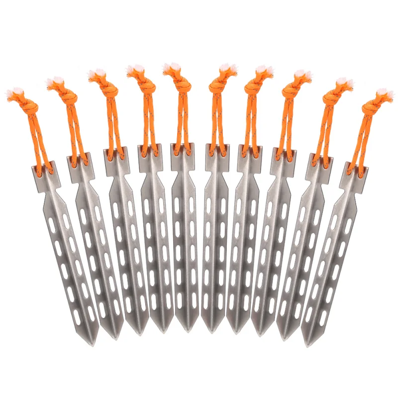 Особенности:Титановые кольи очень прочные и легкие.6,3 дюймов в длину-достаточно для того, чтобы ваша палатка крепко держалась в длину землиV-образная форма проникает и надежно удерживает в мягком грунте.Светоотражающий шнур прилагается.Отлично подходит для мягких landforms, snowfield, sand и т. д.Характеристики:Материал: титанКоличество: 6 шт/10 шт (опционально)Длина: 12*12*160 мм/0,5*0,5 * 6.3inБлок Вес: 15 г/0,5 унцииПосылка:6 * колышки для палаток