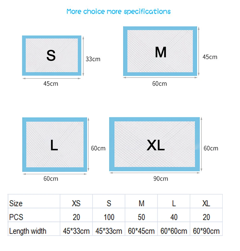 Название: одноразовый коврик для подгузниковМатериал: впитывающий хлопокЦвет: как на фотоРазмер:-XS (20 шт./компл.): 33x45 см-S (100 шт./компл.): 33x45 см-M (50 шт./компл.): 45x60 см-L (40 шт./компл.): 60x60 см-XL (20 шт./компл.): 60x90 смОсобенности:-Верхний слой из нетканого материала для быстрого впитывания воды, освежает и дезодорирует.-Одноразовый и безопасный, не менее используется для за один день.-Экологически чистая ткань, мягкая и дышащая, устойчивая к разрыву и герметичная для вашей собаки.-Он обеспечит отличную защиту и чистоту вашего пола.-Вы можете положить его на пол, ванную комнату, питомник, сумку для домашних животных или даже использовать как полотенце для ваших питомцев и т. д.