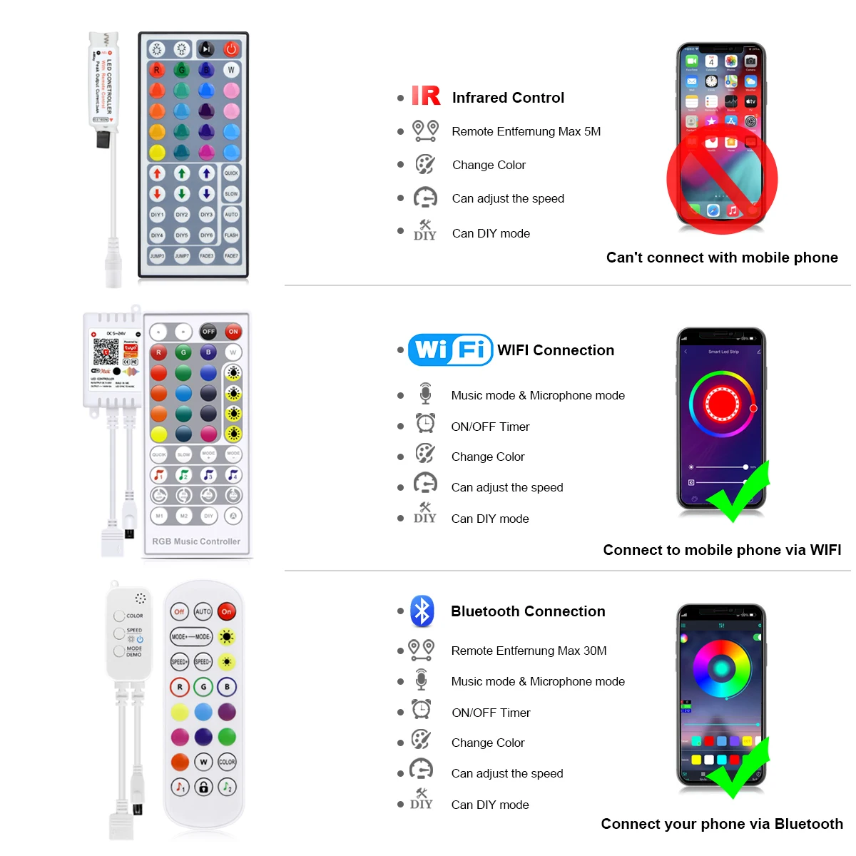 Разделение:Обратите внимание, что существует 3 типа светодиодного комплекта:1. WIFI + ИК-контроль2. Bluetooth + ИК-контроль3. ИК-управление без wifi Без BluetoothSMD 5050 Светодиодная лентаШирина: 10 ммСветильник Цвет: разноцветный "Красный-зелёный-желтыйВодонепроницаемый: не водонепроницаемый IP20Напряжение: 12 В постоянного токаДлина: 5 м/10 м/15 м/20 м/катушка