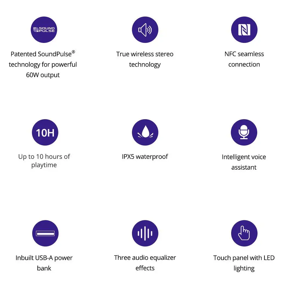 1. SoundPulse®Технологии;2. Номинальная мощность 60 Вт;3. 2,1-канальный аудио для стереозвука усиленных басов;4. TWS для более интенсивного звука;5. Бесшовное соединение NFC;6. Три EQ эффектов переключаемый и 10-часов проигрывания;7. IPX5 Водонепроницаемый, голосовой помощник и интуитивно понятная сенсорная панель.* Оснащен 2 твитерами, 1 НЧ-динамик вместе с 1 пассивным радиатором и 2 усилителями, обеспечивает определенный звук.