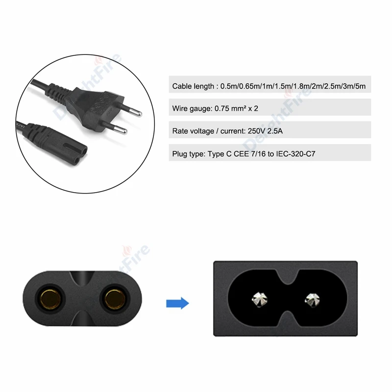 100% абсолютно новый европейский штекер Рисунок 8 IEC C7 Кабель питания Шнур Калибр провода: 0,75 мм² x 2 Напряжение тока/ток: 250V 2.5A Материал проводника: медь Изоляционный материал: ПВХ Тип штекера: штепсельная вилка европейского стандарта типа C Тип наконечника: IEC-320-C7 Длина кабеля (прибл.): 0,5 м/0,65 м/1 м/1,5 м/1,8 м/2 м/2,5 м/3 м/5m опциональноПакет включает в себя: