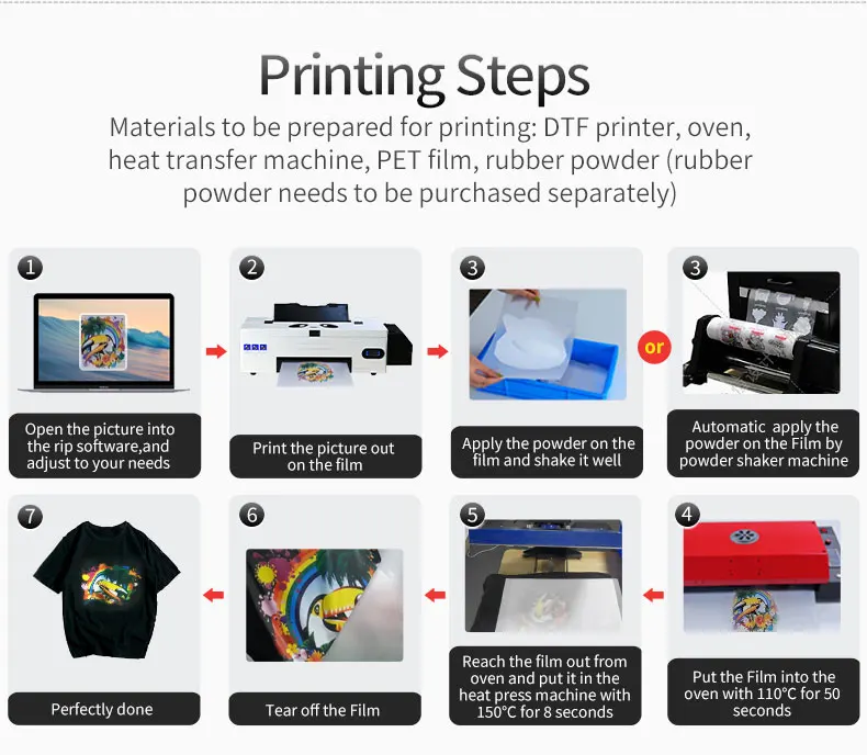 Материалы, которые должны быть подготовлены для печати: DTF принтер, печь, машина теплопередачи, ПЭТ пленка, резиновый порошок (резиновый порошок необходимо приобрести отдельно)