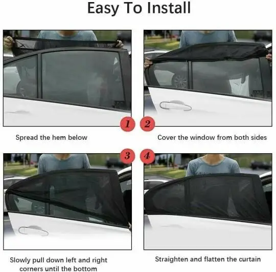 Автомобильный козырек от солнца на боковое окно изготовлен из высокоэластичной нейлоновой сетчатой ткани, легко носить, как показано на рисунке, шаг за шагом, не нужно никаких присосок или пасты, полностью закрывает окно автомобиля.