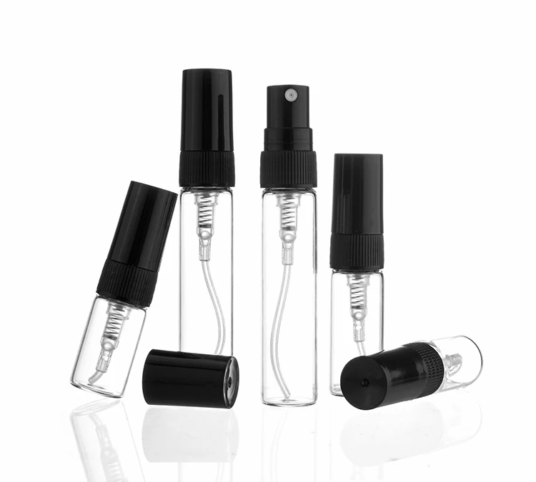 Прозрачный черный стеклянный флакон с распылителем, 50 шт.лот, 2 мл, 3 мл, 5 мл, 10 мл, мини-Пробирка для образцов, тонкие стеклянные флаконы, черный распылитель для духов