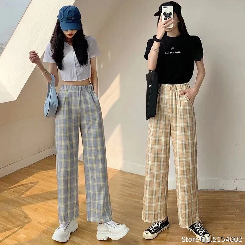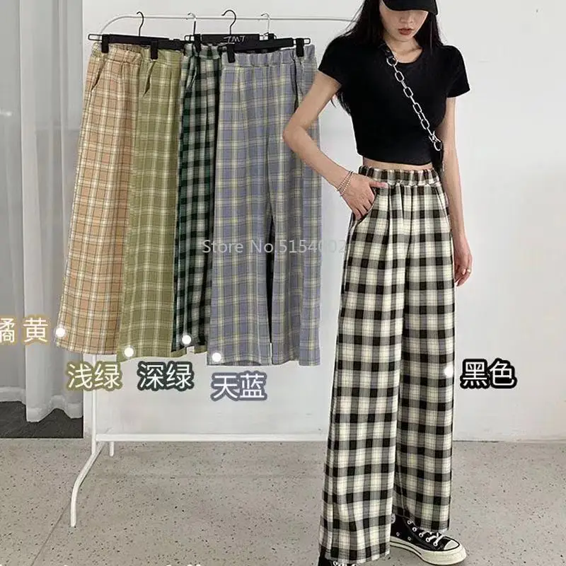 Размера плюс, новые корейские Стиль штаны в клетку; Сезон весна; Модная 2021 широкие брюки для женщин с принтом в клетку с завышенной талией размера плюс штаны для женщин
