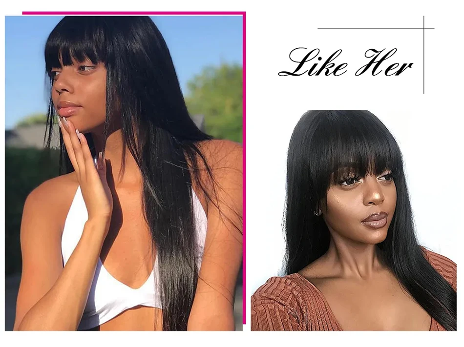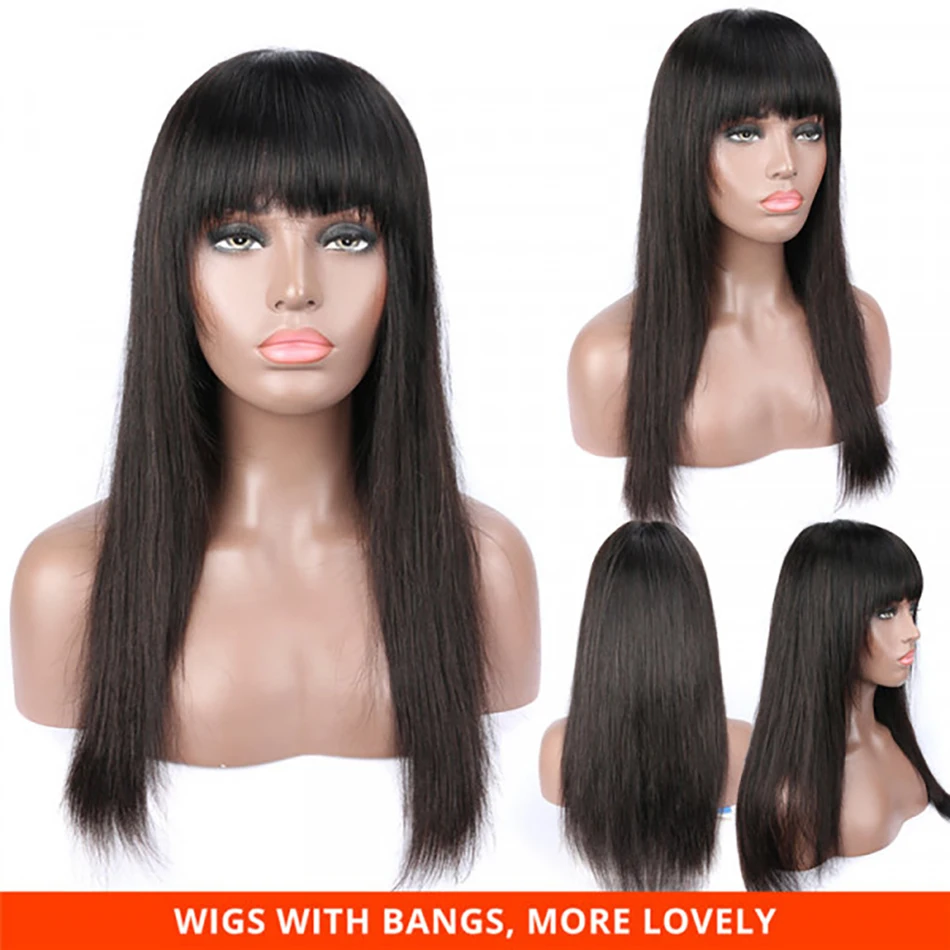 -Текстура: прямые парики из натуральных волос с челкой-Тип наращивания волос: прямые парики из человеческих волос с челкой-Плотность: 150% плотность человеческих волос парики с челкой-Цвет: Естественный цвет-Длина парика: 10-30 дюймов в наличии-Крышка парика: дышащая сетчатая крышка-Способ изготовления: машинные парики, без кружевных фронтальных париков-Преимущества: мягкий, удобный, долгое время использования, это очень хороший выбор в качестве праздничного подарка