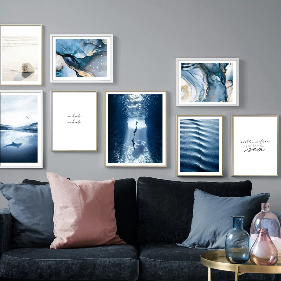Дайвинг Пара Дельфин синий бант волна пляжная Морская раковина скандинавский плакат настенный художественный Принт Холст Картина Декор картинки для гостиной