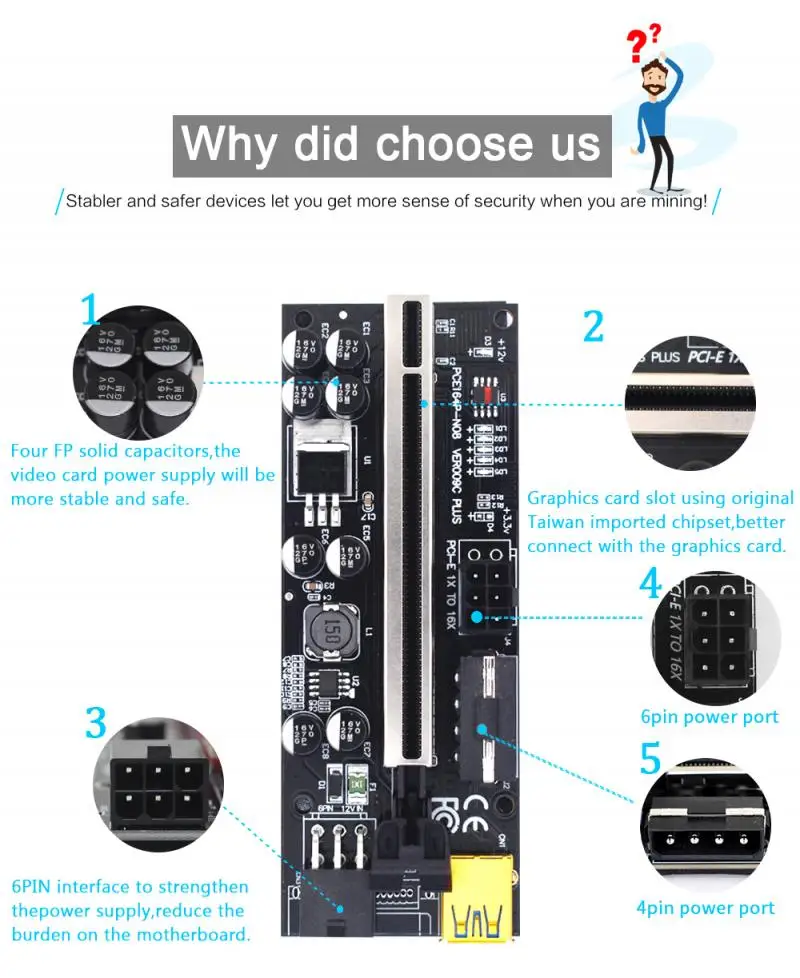 2: карта адаптера имеет 6-контактный интерфейс и Усовершенствованный DC-DC 12 В для увеличения источника питания, так что блок питания видеокарты не зависит от материнской платы, тем самым уменьшая нагрузку на материнскую плату при подключении нескольких графических карт.