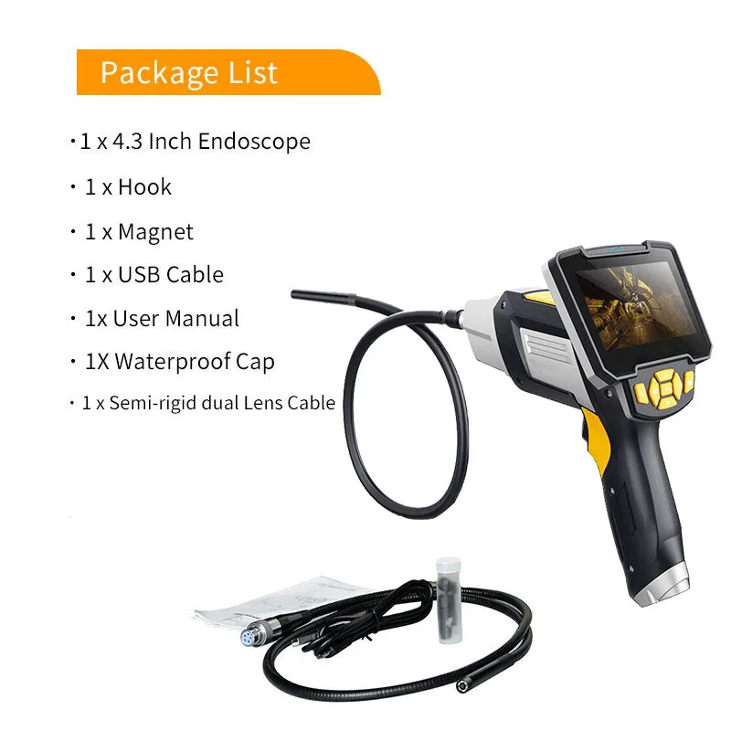 1x4,3 Inch контактный эндоскоп 1 х Полужесткий двойной кабель объектива 1 х крючок 1 х Магнит 1 х USB кабель 1x Руководство пользователя 1 водонепроницаемая крышка