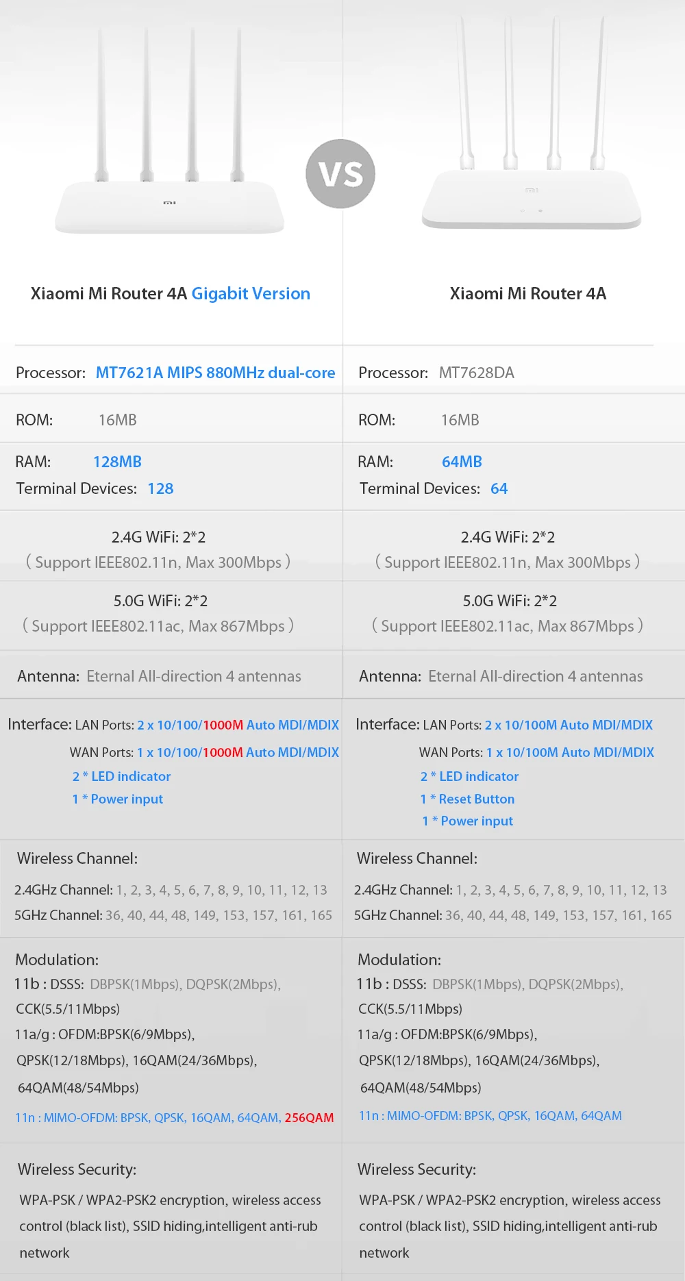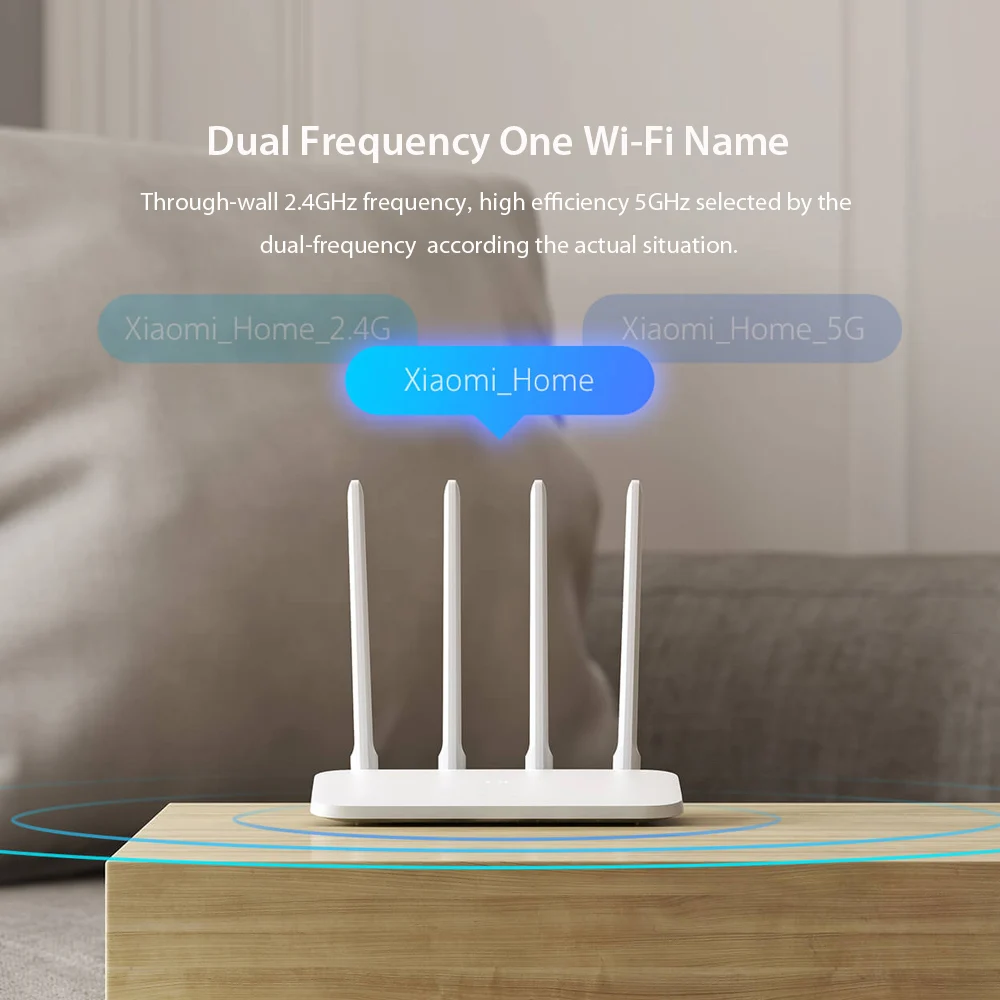 Mi роутер 4A гигабитная версия поддерживает два диапазона частот 2,4 ГГц и 5 ГГц достигает до 1167 Мбит/с, из не вредит экологии матовый пластик материал и оснащена четырьмя внешние антенны с высоким коэффициентом усиления. Он также имеет двухъядерный процессор MT7621A MIPS 880MHz с четырьмя потоками и 128 МБ большой памяти и стабильные устройства 128, умно управляя сетью через приложение MiWiFi.
