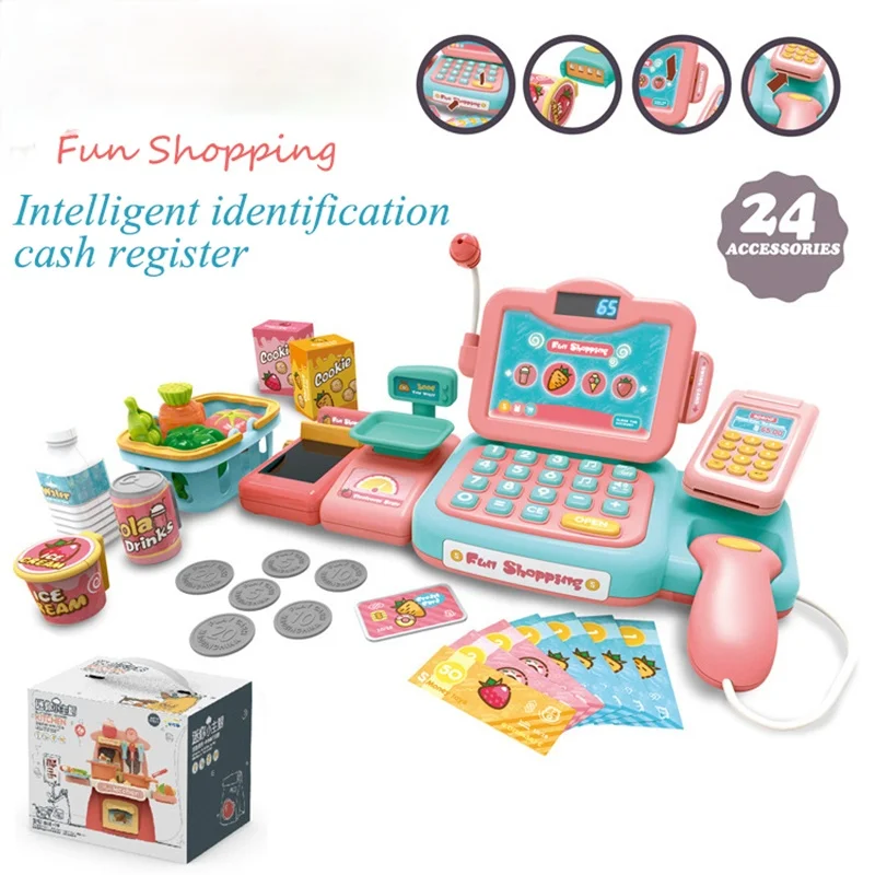 Абсолютно новый подлинный! Детский супермаркет кассовый аппарат Игрушка Маленькая девочка моделирование Кредитная карта кассовый аппарат Игрушка Материал: пластик цвет изделия: 2 вида цветов аксессуары для товара: 24 Функция продукта: с распознаванием голоса, калькулятор, общественный адрес