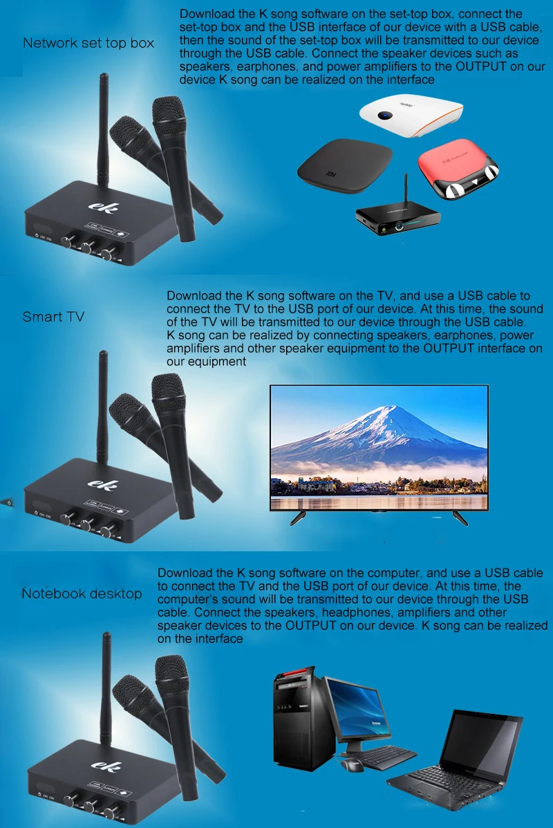 Используя современные Высокотехнологичные технологии, совершенно новый и оригинальный дизайн, со смарт-терминалами (такие как смартфоны, IPAD, smart TV и смарт-приставки), вы можете немедленно испытать удовольствие от KTV, которое не может быть достигнуто с традиционным оборудованием, таким как в хорошем состоянии., Вы можете записывать и делиться своей работой с друзьями из сети в любое время. В этом продукте используются импортные высокоинтегрированные чипы, низкое энергопотребление, высокая чувствительность и сильная защита от помех. Это оружие K song для интеллектуальной сети, позволяющее ощутить ощущение звезды.