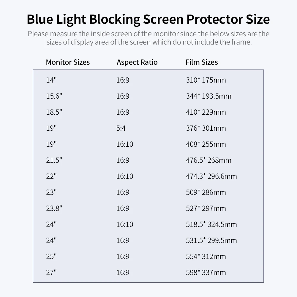 13, пленка для 27 "монитора с соотношением сторон 16:9Спецификация:Материал: ПЭТРазмер товара: 598*337*0,39 мм/23,54*13,27*0,02 дюймаРазмер упаковки: 618*386*3 мм/24,33*15,2 * 0.12inВес упаковки: 305 г/10,76 унцийУпаковочный лист:1 * синий свет блокировки экрана протектор1 * пакет установки (двухсторонние ленты, скользящие клейкие вкладки, ткань для очистки)