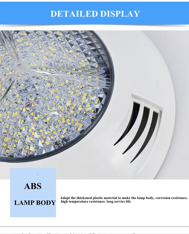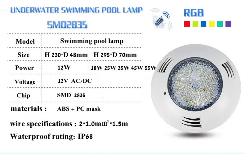 Тип изделия: фонари для бассейнаСветовая эффективность (лм/Вт):100Входное напряжение (В):12Мощность лампы (Вт):12/18/25/35/45IP Рейтинг: IP68Сертификация: CE, FCC, RoHSМатериал корпуса лампы: АБС-пластикРазмер одной посылка: 31X31X15 смОдиночный вес брутто: 1,4 кг