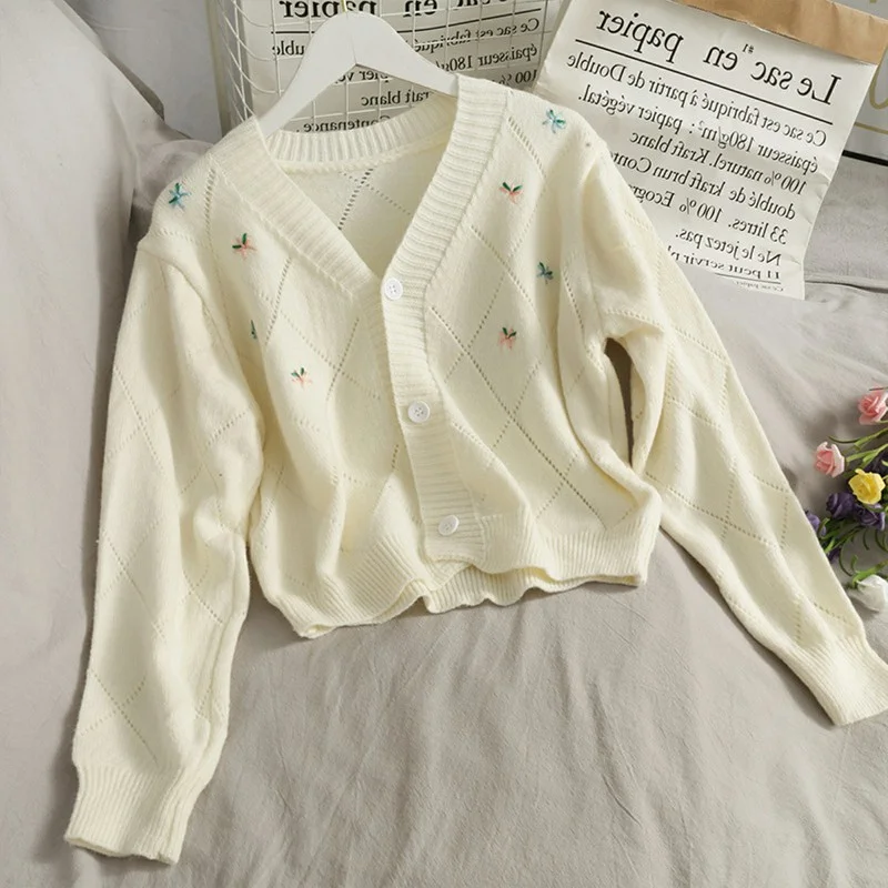Женский вязаный кардиган с цветочной вышивкой в Корейском стиле, свободный белый свитер с V-образным вырезом в стиле ретро