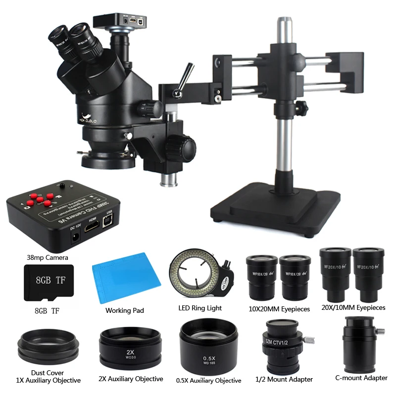 Тринокулярный стереомикроскоп Full HD с 180-кратным увеличением, с 2-кратным0,5-кратным увеличением, с двойной стрелой и подставкой, включает 38MP 2K HDMI-камеру