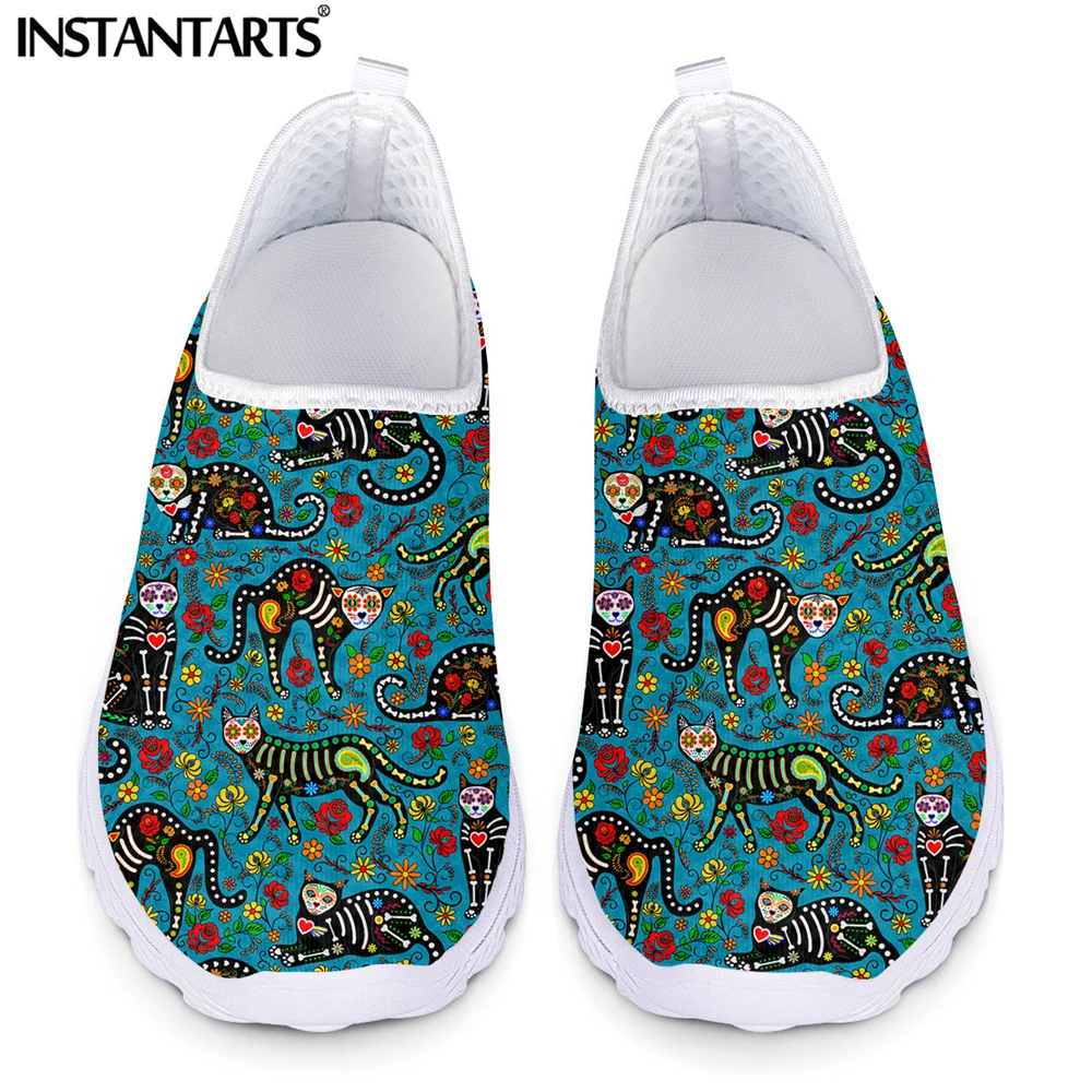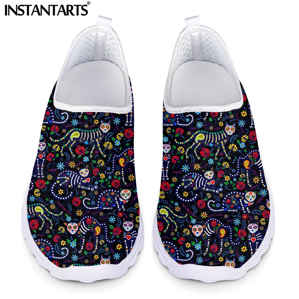 Женские кроссовки без шнуровки INSTANTARTS, летние дышащие сетчатые сникерсы на плоской подошве, с изображением сахарного черепа и кошек, 2021