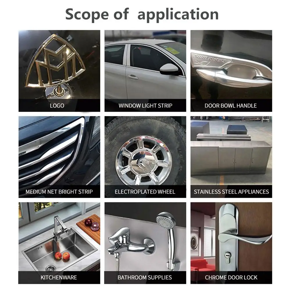 Инструкции: 1. Сначала протрите поверхность пылью тряпкой. 2. Распылите изделие на хромированную пластину в течение 1-3 минут. 3. Затем очистите щеткой или полотенцем. 4. Наконец, очистите его водой.
