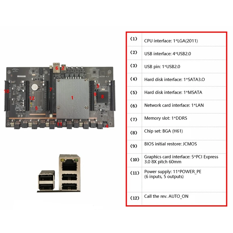 Тип памяти: DDR3 поддерживает настольную и серверную памятьМаксимальная емкость памяти: поддержка 32GОписание памяти: Поддержка частоты 1066/1333/1600/1866 МГцНабор микросхем: для H61Аудио чип: N/AЧип сетевой карты: 1 * REALIEK 8105E 100M сетевая картаМатеринская плата BTC79X5 V1.0 использует чип H61 и слот 2011, размер 322*188 мм; 5 интерфейсов видеокарт Pcie3.0 X8 разработаны с интервалом 60 мм, которые могут поддерживать видеокарты RTX3060, а вычислительная мощность одной карты составляет до 48MH/s или более. Он отлично поддерживает видеопамять 4G и видеокарту, что значительно улучшает функцию майнинга вычислительной мощности.Интерфейс процессора: LGA(2011)Интерфейс USB: 4 * USB2.0Usb-разъем: 1 * USB2.0Интерфейс жесткого диска: 1 * SATA3.0Интерфейс жесткого диска: 1 * MSATAИнтерфейс сетевой карты: 1 * LANСлот памяти: 1 * DDR3Микросхема: BGA (H61)Начальное восстановление BIOS: JCMOSИнтерфейс видеокарты: 5 * PCI Express 3,0 8X, шаг 60 ммМатеринская плата/Видеокарта Источник питания: 11 * POWER_PE (6 входов, 5 выходов)Самоинициированный вызов: AUTO_ONЦвет: черныйМатериал: PCBРазмер: 322x188 ммПосылка:1 * материнская плата (цвет слота и нижней пластины случайный, и указанный цвет не принимается)Только вышеуказанная посылка, другие товары не включены.Примечание: светильник и различные дисплеи могут привести к тому, что цвет товара на картинке немного отличается от реального. Допускается погрешность в измерениях +/- 1-3 см.