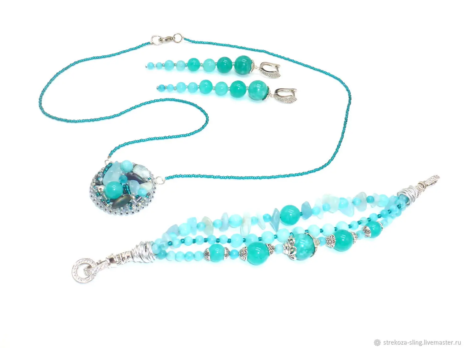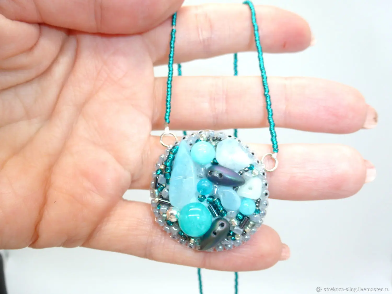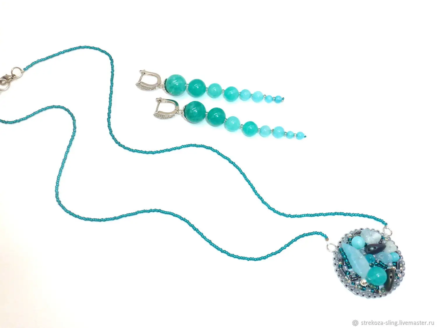 Само ожерелье из японского бисера высшего качества на нитке. В кулоне для вышивки использованы бусины амазонита, крошка аквамарина, бисер Тохо японский, стеклярус Тохо.