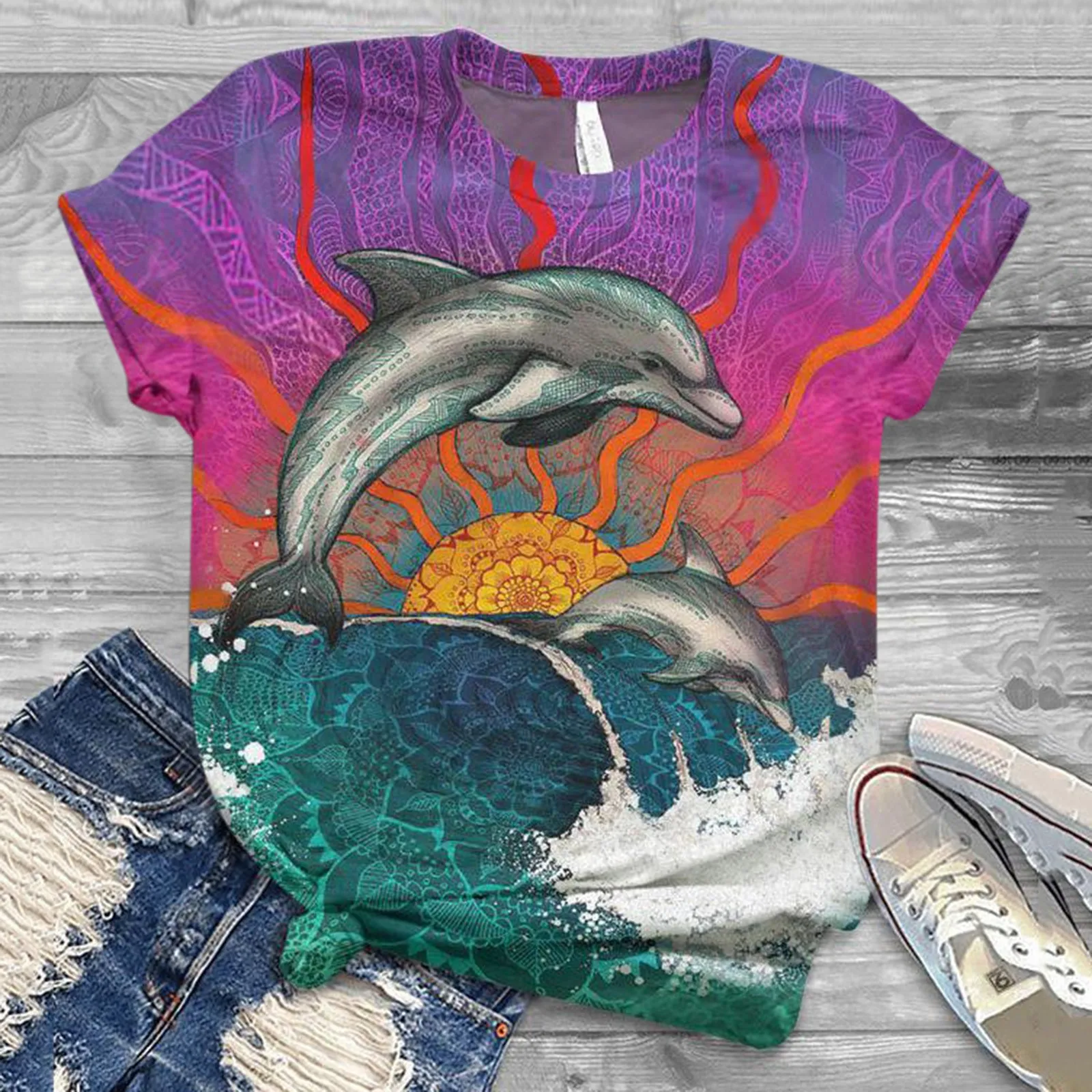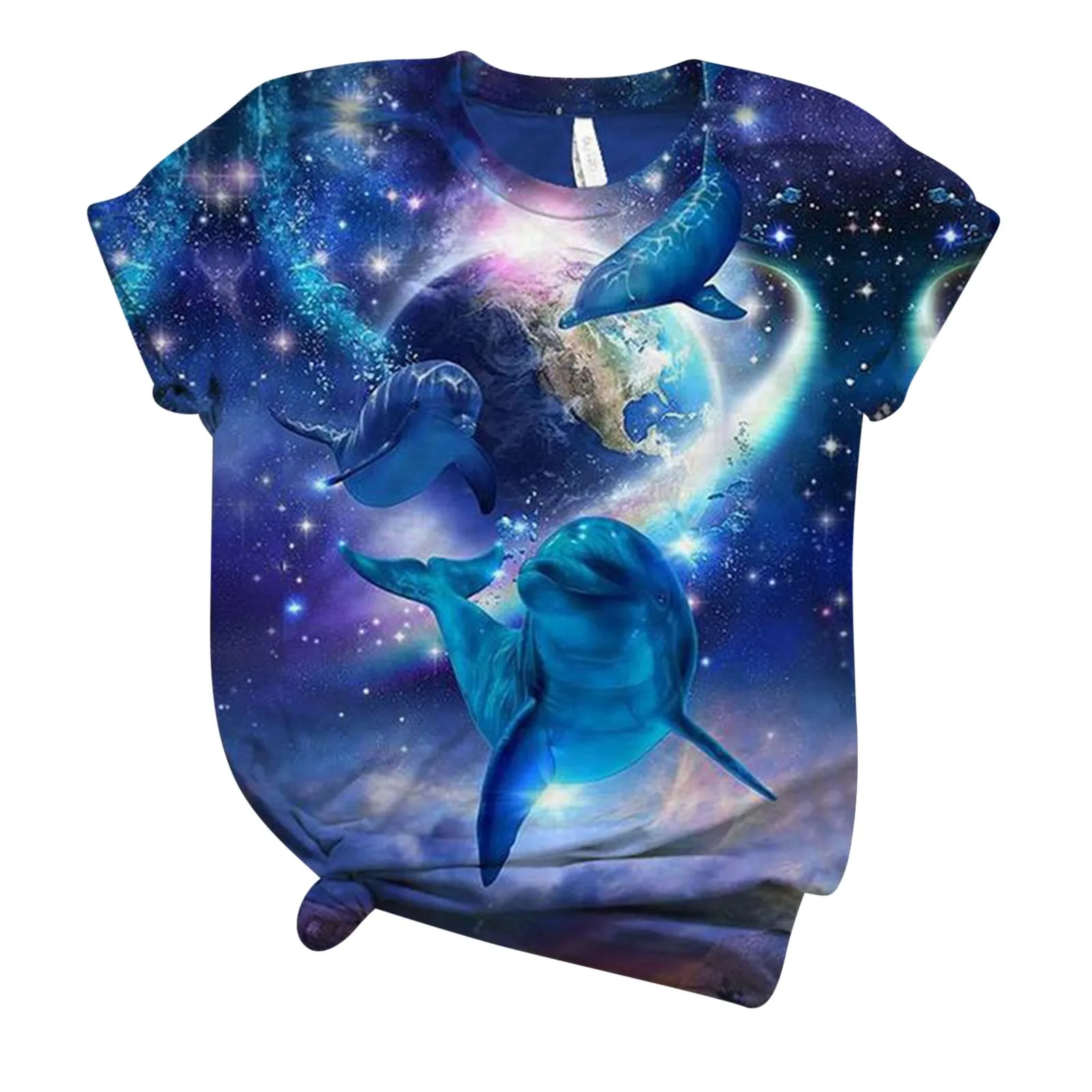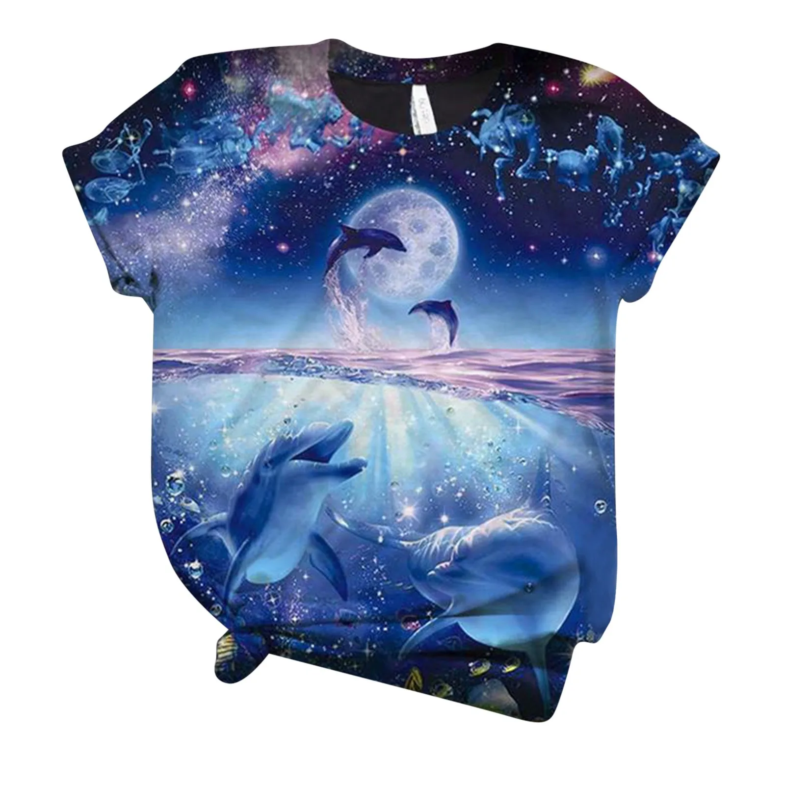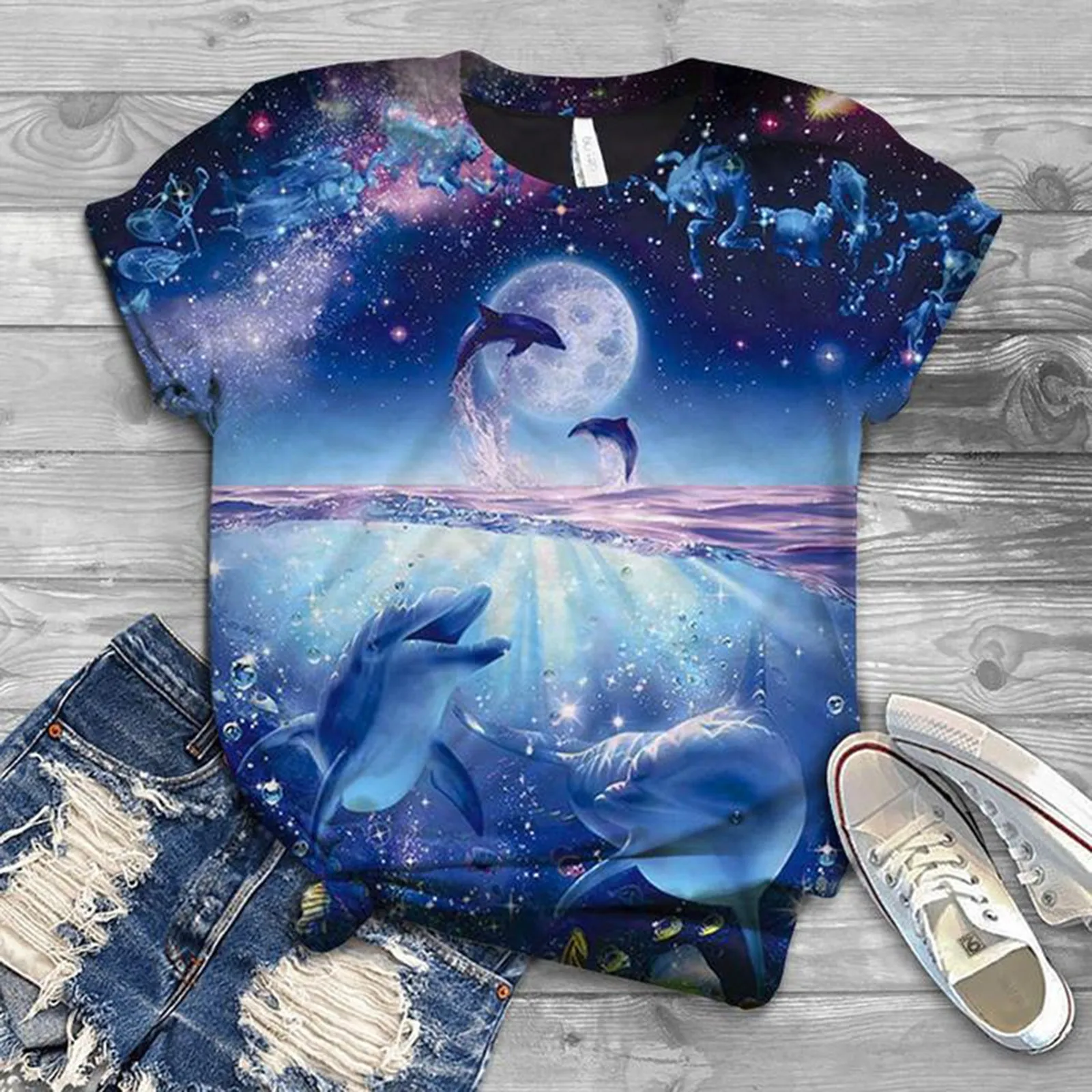 Женская футболка с рисунком животного, летняя футболка с 3D-принтом дельфина и круглым вырезом