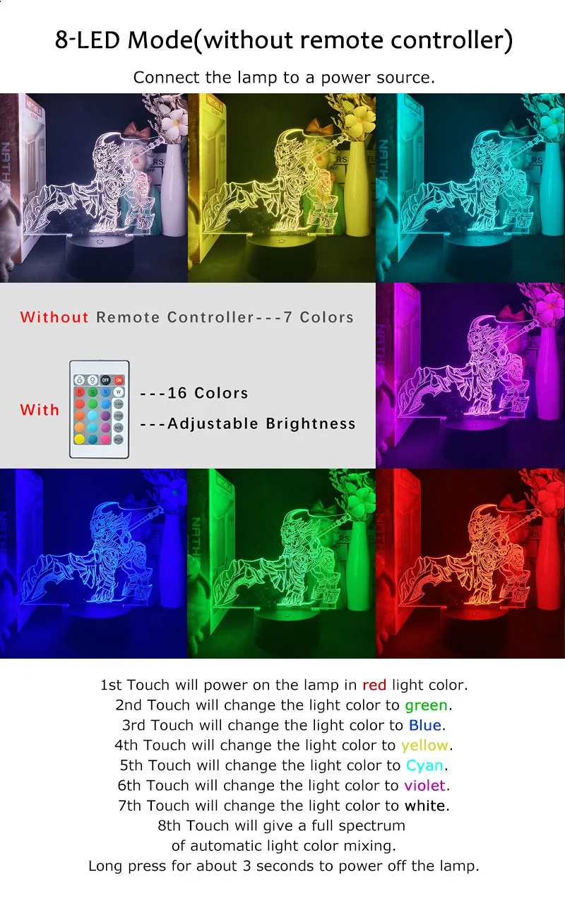 Это потрясающий художественный декор для украшения дома.Лампы высотой около 20 см и могут осветить ваше пространство 7 разными цветами (красный, желтый, зеленый, голубой, синий, фиолетовый, белый) и множеством различных оттенков.Каждая лампа поставляется с твердым полимерным основанием, в котором находятся батареи 3AA и usb-кабели и в 2 различных видах-твердая черная/трещина лава.Вы получите то, что выберете. Основание черной лампы: только восходящее освещение, и он выделит векторный график.Основание лампы лавы: светильник излучает все направления и дает кристально чистый светильник. 7 цветов без пульта дистанционного управления:Если вы минималистичный и предпочитаете Базовые цвета, вы можете выбрать наш сенсорный вариант, в котором вы можете изменить цвет одним касанием на основе. 16 цветов с пультом дистанционного управления:Чтобы выбрать больше цветов и режимов освещения, вы можете перейти к нашему удаленному типу.С помощью пульта дистанционного управления вы можете легко переключать цвета, регулировать яркость, оттенки, а также иметь другие варианты, такие как позволяет цветам выцветать друг в друга и контролировать скорость цветовых переключателей, если вы хотите. Наши 3D лампы с лазерной гравировкой делают идеальный подарок на Рождество, день рождения, новый год или дом теплым для ваших друзей аниме-ботаников!Обязательно оставьте нам отзыв о Вашем товаре и не стесняйтесь обращаться к нам по любым вопросам с вашим заказом! Обратите внимание:● Перед вставкой в основание снимите защитную пленку с поверхности как спереди, так и сзади.● Чтобы не оставлять отпечатков пальцев на акриле, удерживайте доску на кромке, а не на поверхности.