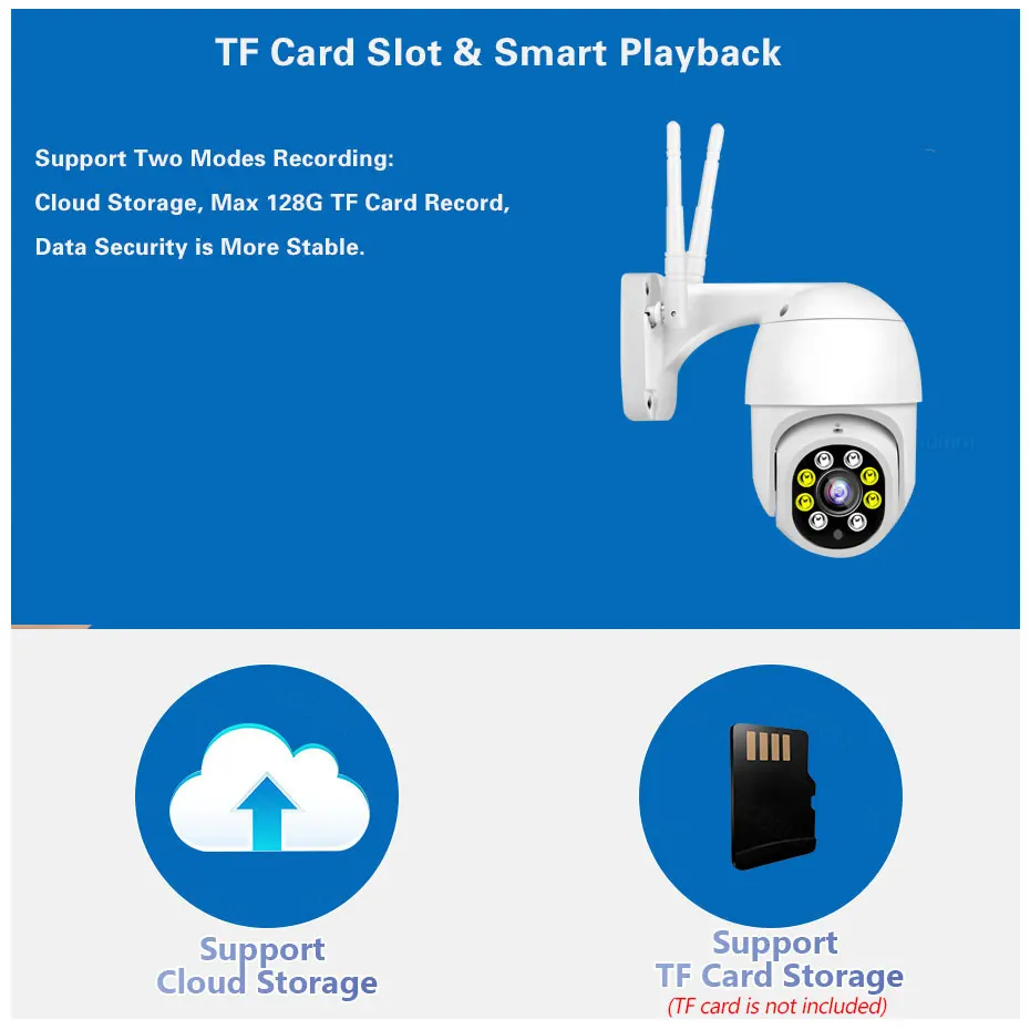 Камера поддерживает Локальное резервное копирование до 128 Гб TF карты, а также предоставляет Облачное хранилище (необходимо оплатить дополнительные расходы).Время записи видео на tf-карте только для справки, конкретное время должно основываться на фактическом времени записи.
