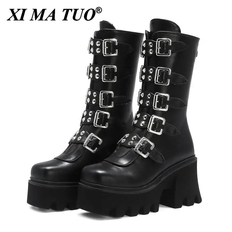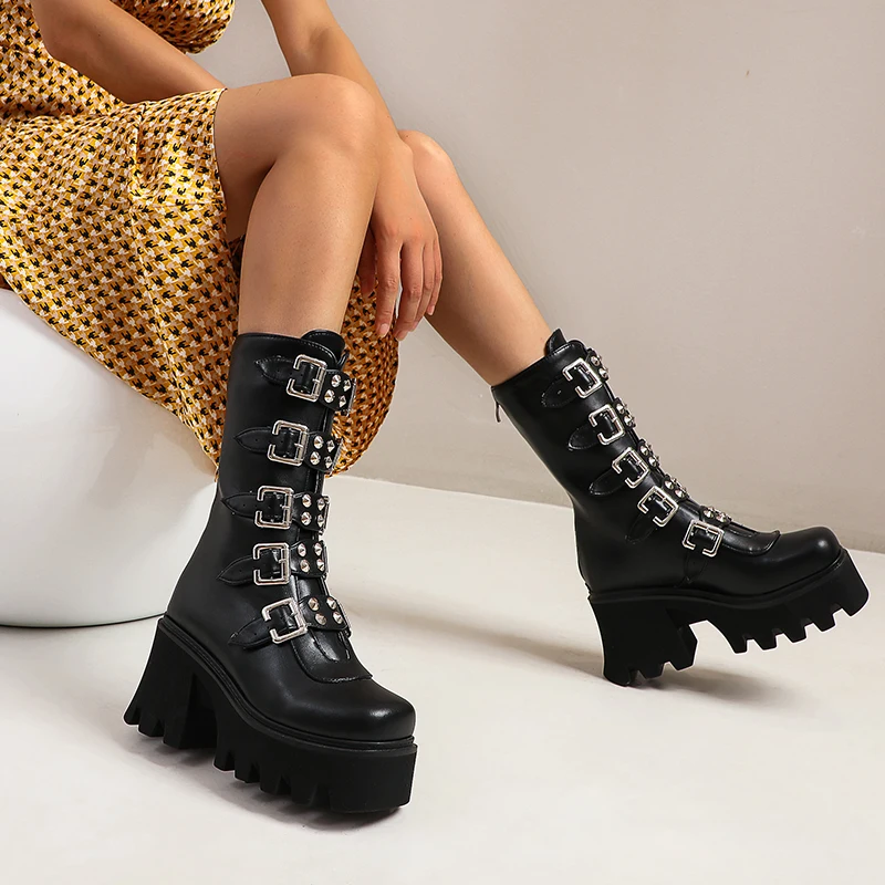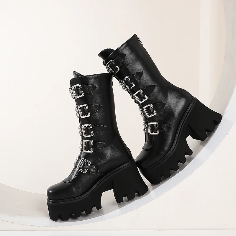 Женские ботинки на платформе, черные ботинки в готическом стиле, до середины икры, на молнии, с пряжкой и ремешком