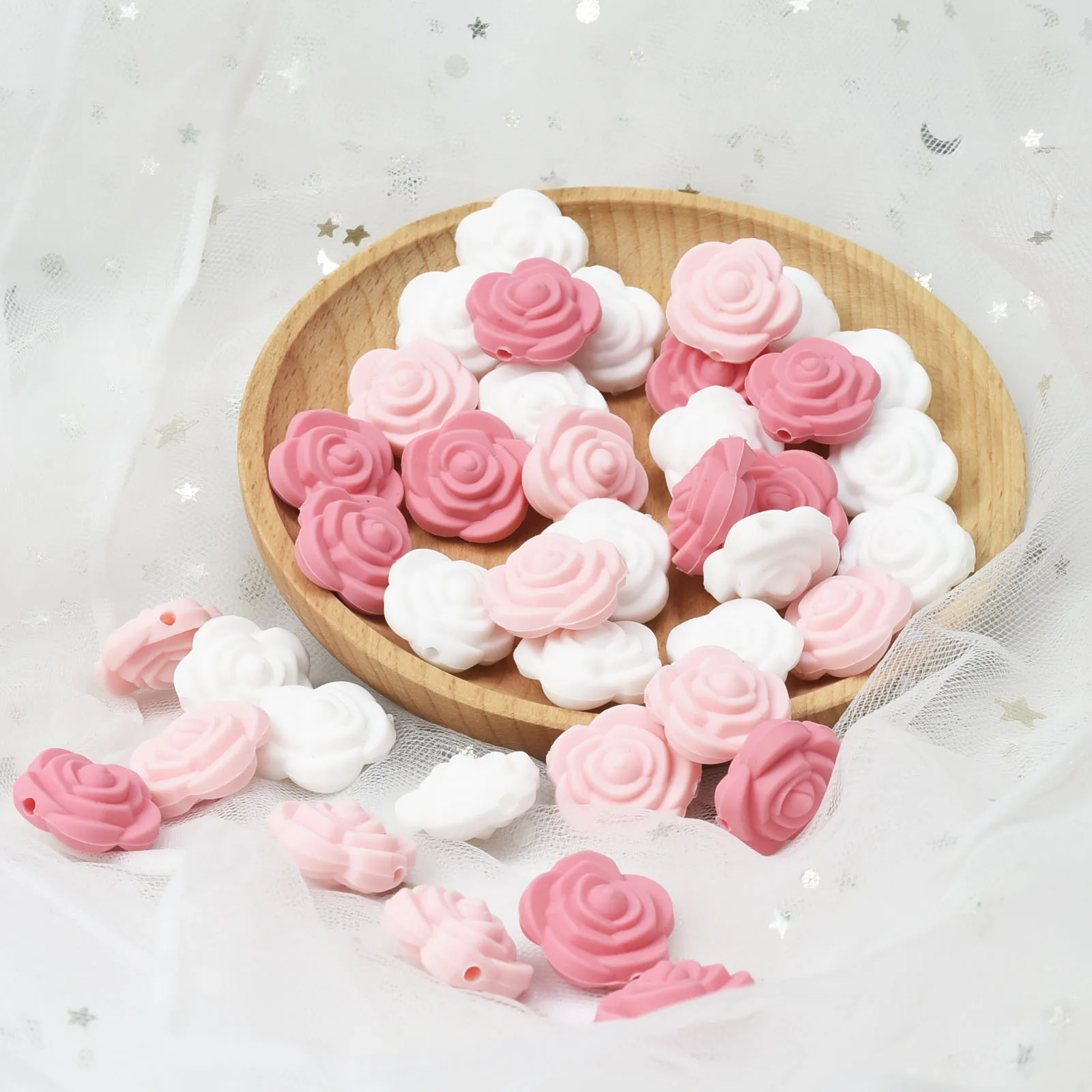30 шт., 3 цвета, 21 мм, силиконовые бусины с двойным лицом, цветок, роза, прорезыватель, очаровательный Прорезыватель для зубов, для малышей, горячая Распродажа, ожерелье, мягкая жевательная игрушка в подарок
