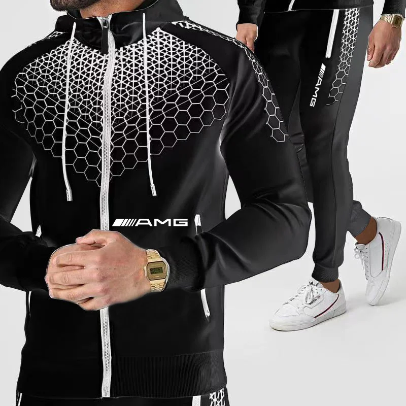 Весна-Осень 2021, брендовый модный мужской кардиган AMG на молнии, спортивная одежда из двух предметов, мужской топ с капюшоном, уличные спортивные брюки, спортивные штаны