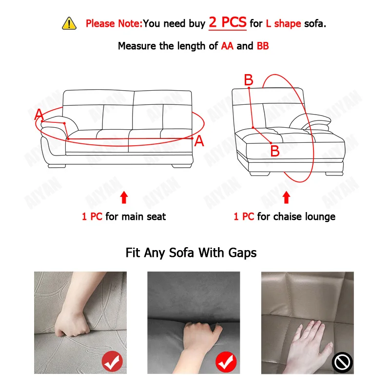 Для L типа или углового или секционного дивана, который в сочетании с 2 частями отдельно, вам нужно заказать 2 шт покрытия для него. Размер чехла будет зависеть от длины линий AA, BB и CC.