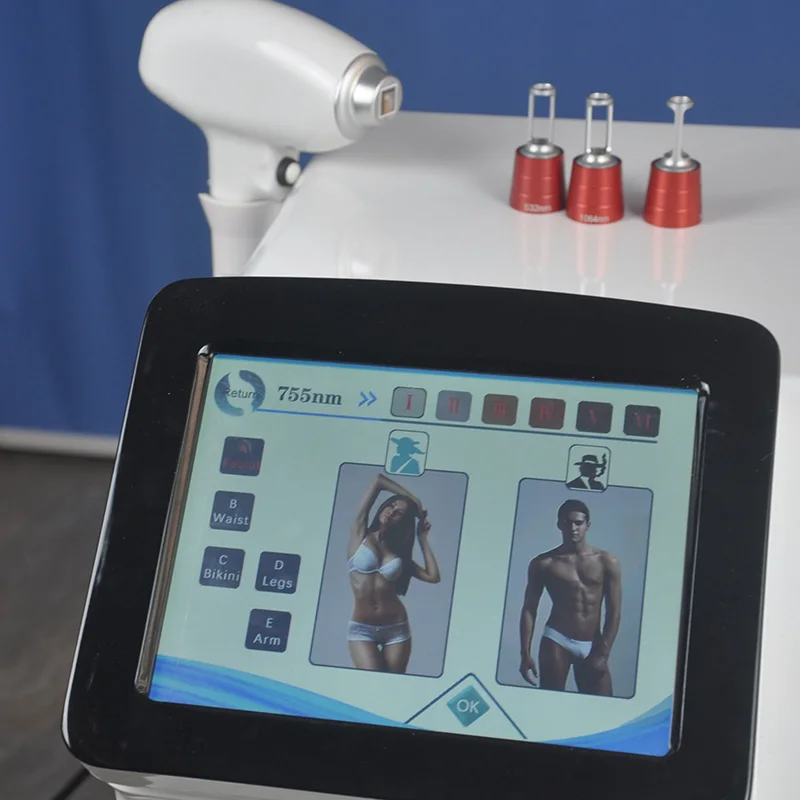 2.808nm + 755nm + 1064nm три лазерных длины волны в сочетании для всех типов кожи лечение 755nm для удаления волос белой кожи 1064nm для удаления черных или темных волос 808nm для другого типа удаление волос цвета кожи