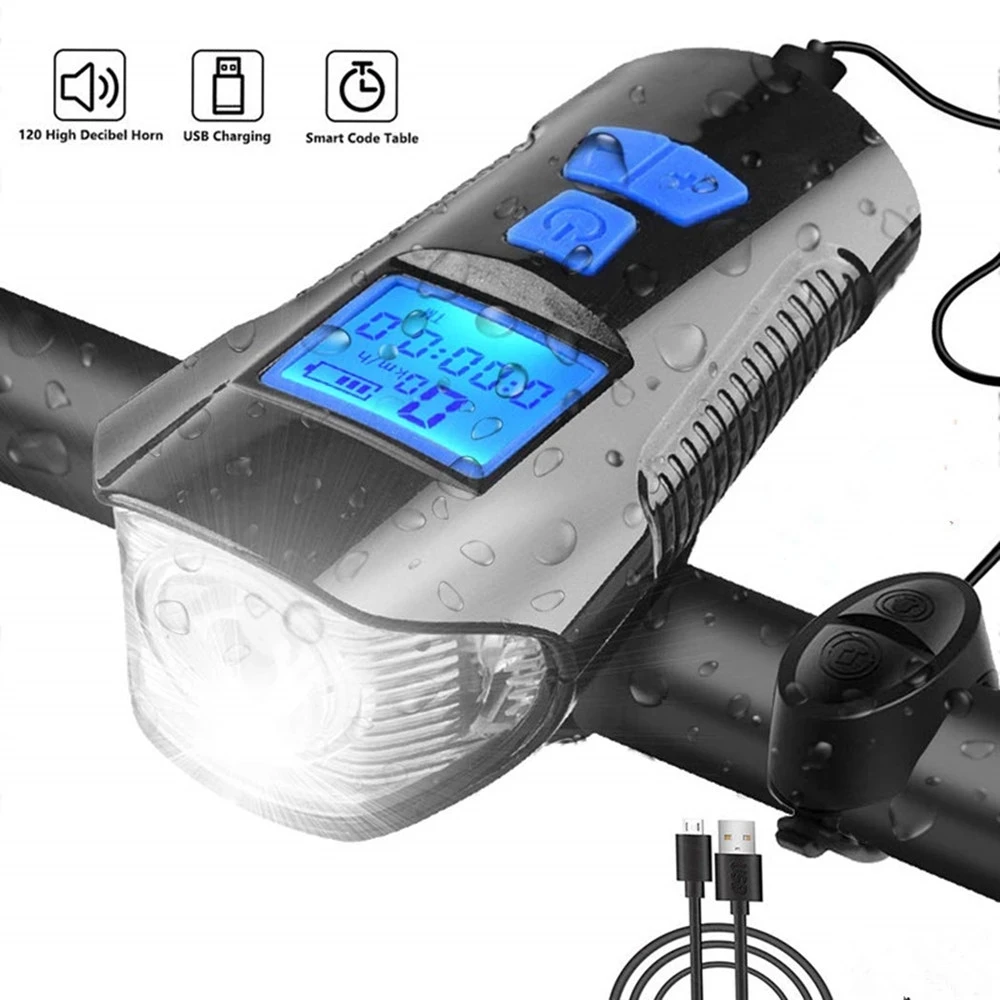 Водонепроницаемый велосипедный светильник USB Перезаряжаемые передняя фара для велосипеда светильник вспышки светильник с велокомпьютер ЖК-дисплей Спидометр велосипедный головной светильник Рог