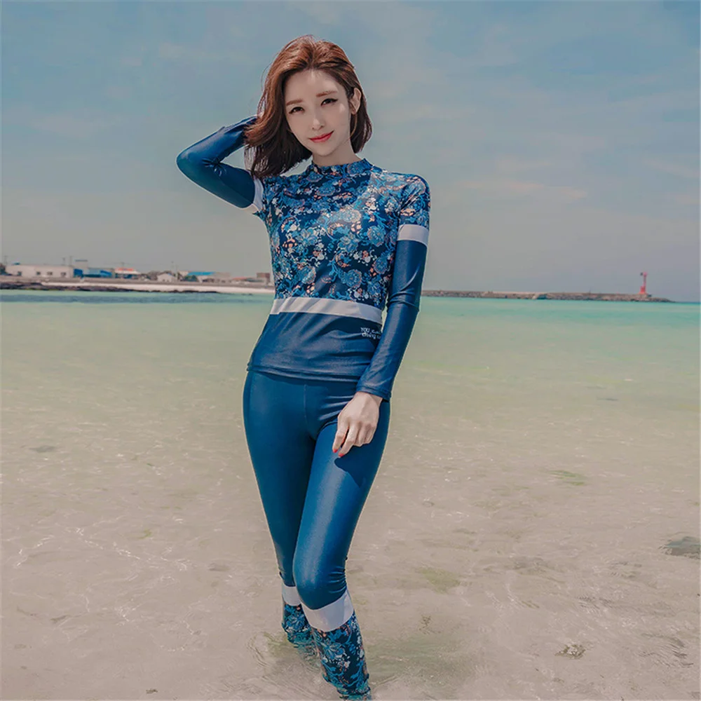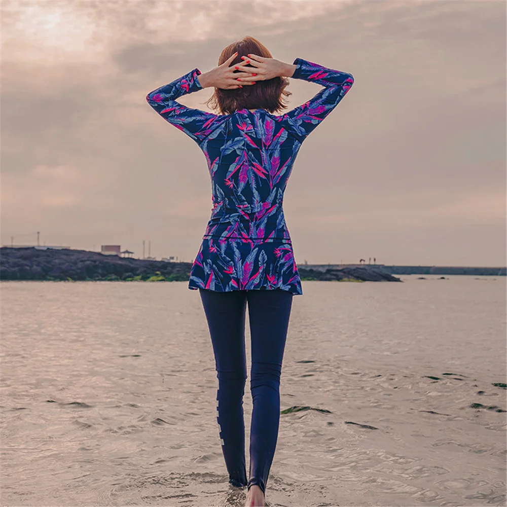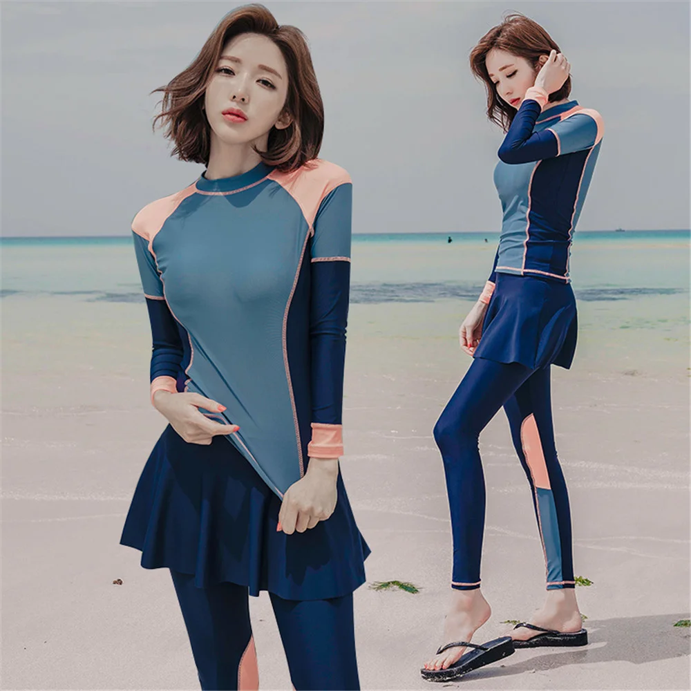 Traje de baño de dos piezas de manga larga para mujer, bragas largas, traje de surf, traje de baño de cuello alto, camisa de buceo, trajes de baño con aumento