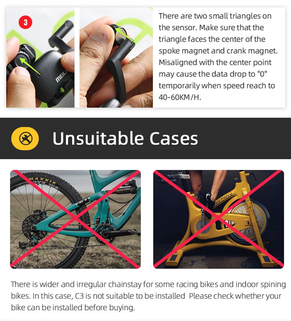 Просто установите датчик в соответствующее место, а затем он может читать данные во время езды на велосипеде. Зазор между датчиком и магнитом должен быть не более 2 см. С двумя специальными держателями, вы можете установить его в разных положениях. Подходит для большинства типов велосипедов: обычных велосипедов, горных велосипедов, дорожных велосипедов, электронных велосипедов, складных велосипедов, почти всех велосипедных велосипедов с каркасом спицевого колеса, Примечание Не подходит для твердых колес.