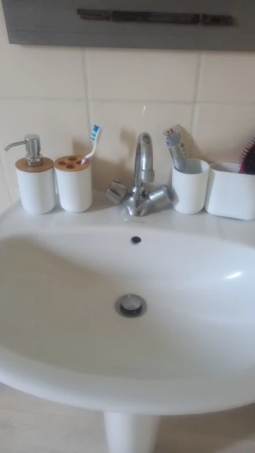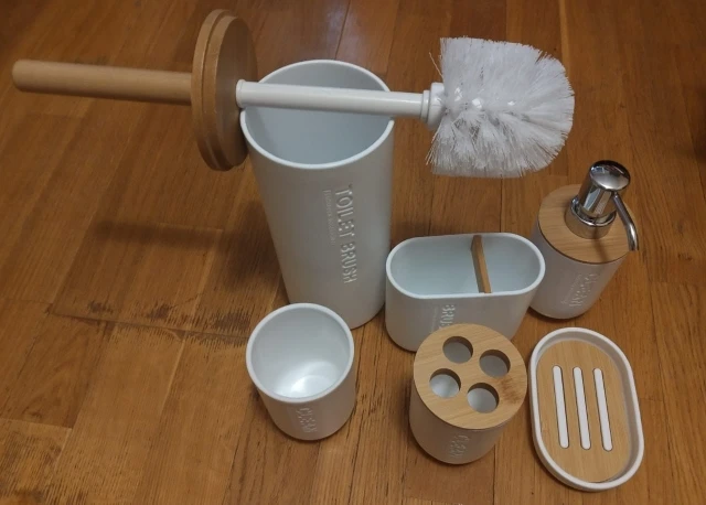 Комплект из шести предметов включает: 1 держатель для туалетной щетки (с деликатной коробкой) 1 мыльница (с деликатной коробкой) 1 дозатор для мыла (с деликатной коробкой) 1 держатель для зубной пасты (с деликатной коробкой) 1x держатель для зубной щетки (с деликатной коробкой) 1x чашка для рта (с деликатной коробкой)