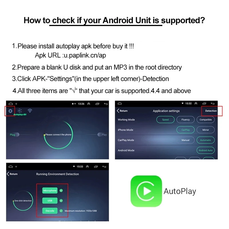 . Перед покупкой вы можете загрузить приложение Autoplay в автомобильном браузере.Скачать URL: u.paplink.cn/ap(Если вы не можете загрузить его успешно, пожалуйста, не покупайте его)2. Автомобильная система: подходит только для автомобильной системы Android 4,4 выше3. Телефон: Для iPhone iOS 10 и выше илиДля Android phone 4,4 версии и вышеПримечание: Беспроводная carplay может быть выполнена с помощью iPhone, но телефоны Android могут быть подключены только к линии передачи данных для достижения carplay