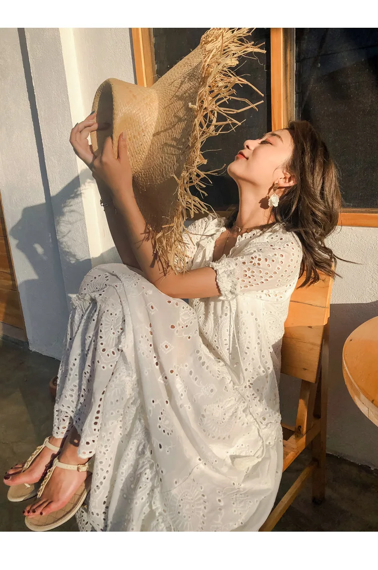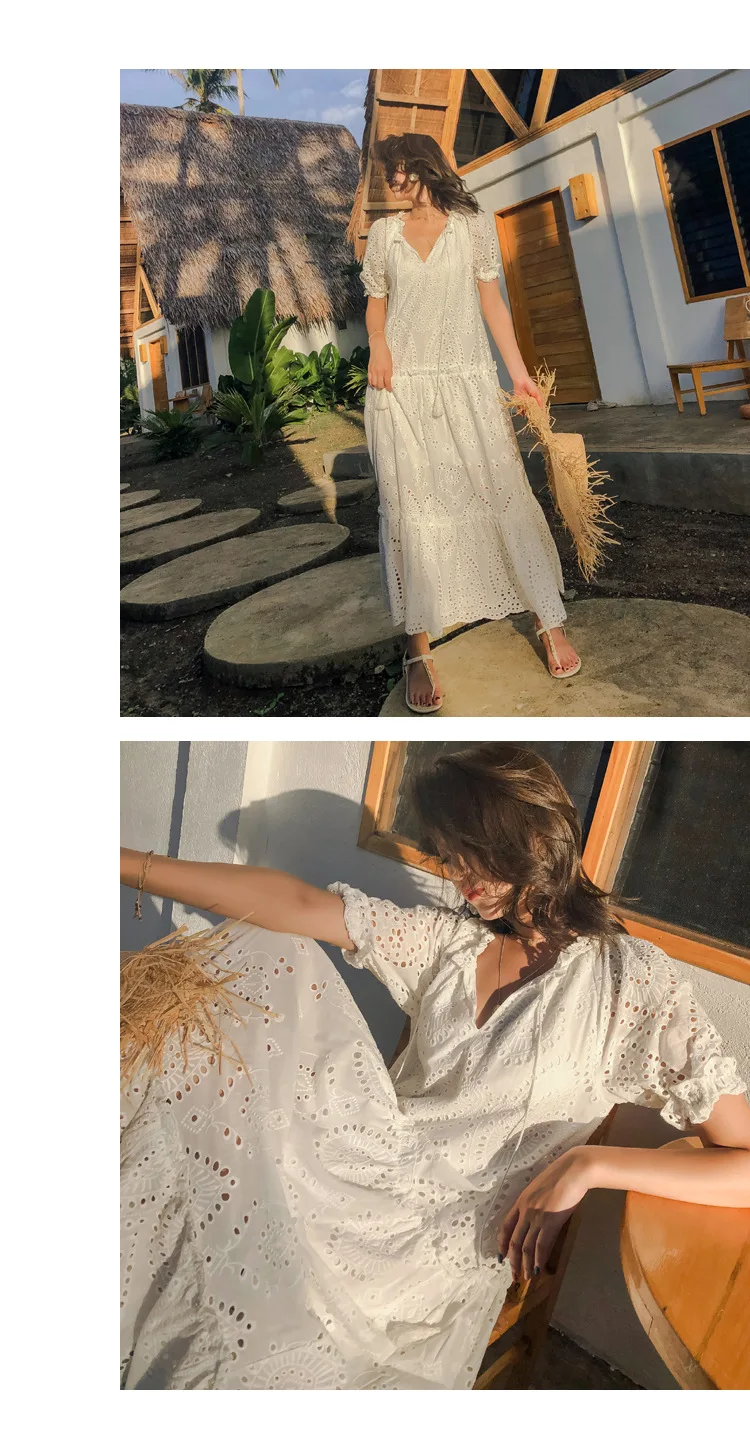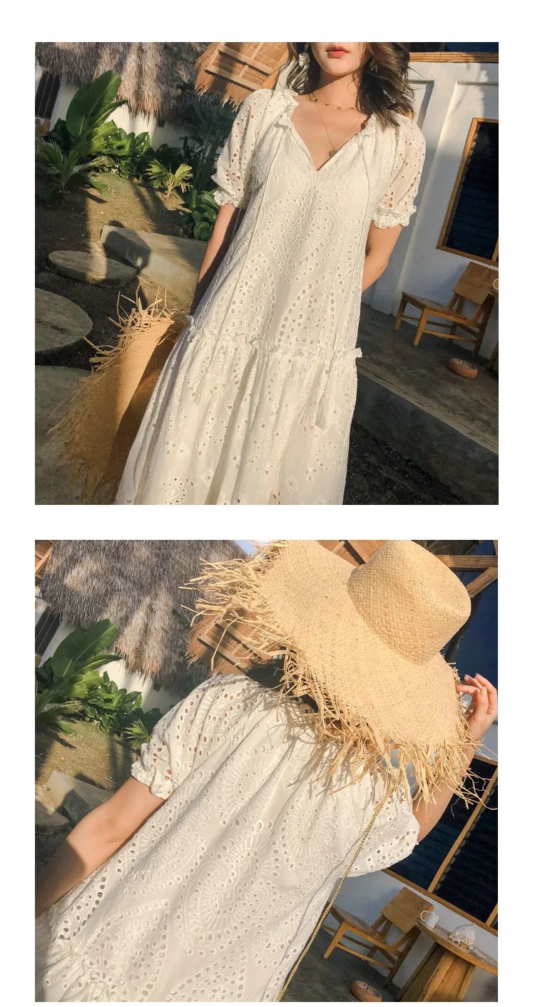 Женское платье с вырезами Johnature, однотонное Свободное платье в богемном стиле с V-образным вырезом и пышными рукавами, в Корейском стиле, для лета, 2021