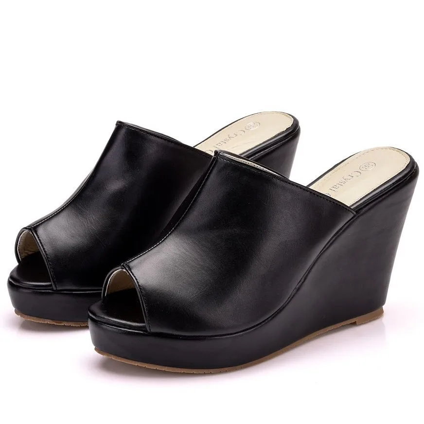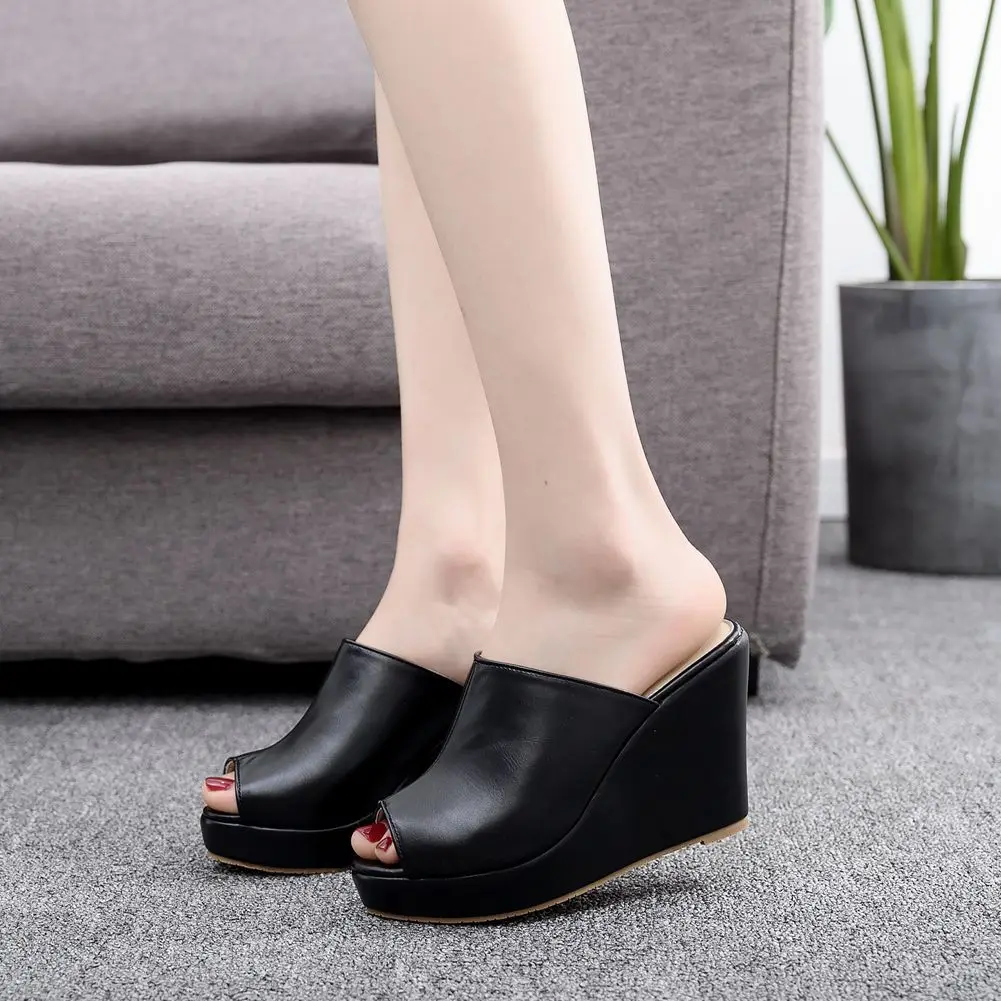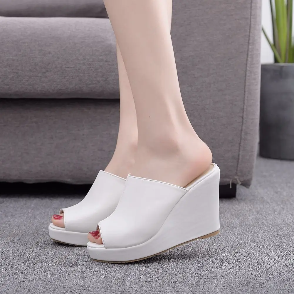Сланцы женские с открытым носком, ПУ кожа, танкетка, высокий каблук, без застежки, Повседневные тапочки, весна, H0156